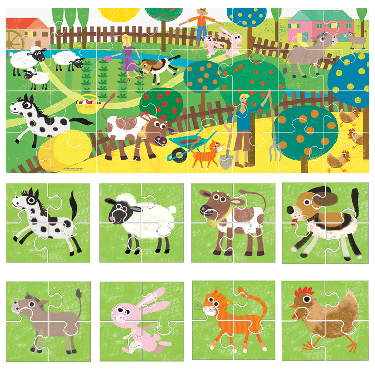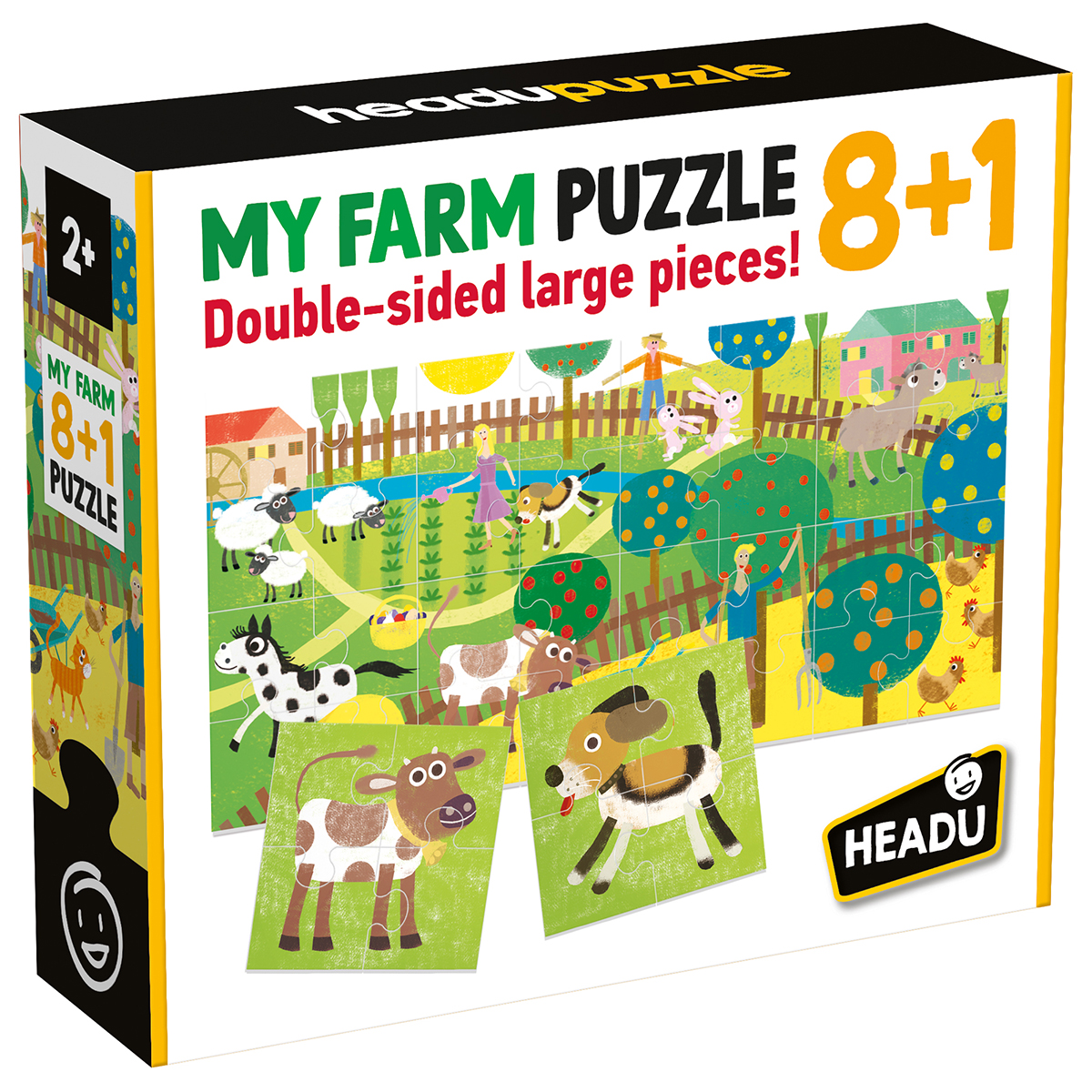 Puzzle 8+1 My Farm für Kinder von 2-5 Jahren. Grosse doppelseitige und besonders stabile Bildkarten, mit denen es viel zu entdecken gibt. Auf der einen Seite setzt das Kind 8 sympathische Jungtiere zusammen, auf der anderen einen Bauernhof voller Leben.