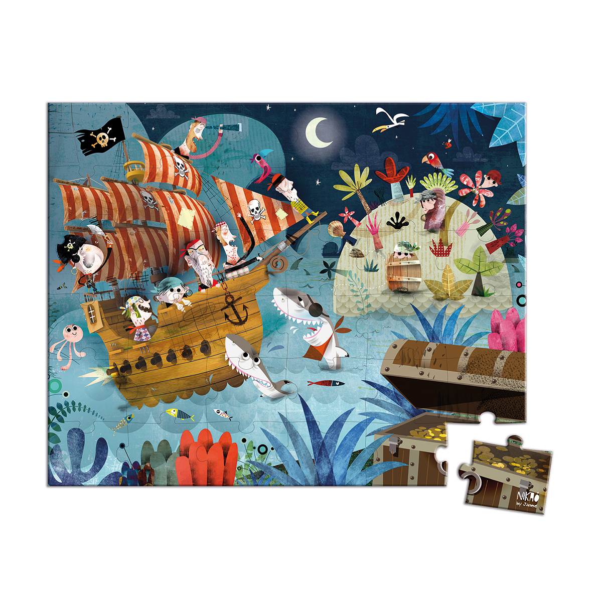 Die Piraten suchen einen Gold- und Silberschatz – begleite Sie mit diesem Puzzle durch die Geheimnisse der Nacht! Doch der Weg zur Schatztruhe ist rau und voller Gefahren! Liebevoll illustriert. Legespass für die Kleinsten garantiert! Geeignet für Kinder von 4 bis 7 Jahren. Enthält ein Poster, das Ihrem Kind als Legehilfe dient. Anzahl der Teile: 36 Hergestellt in Frankreich.