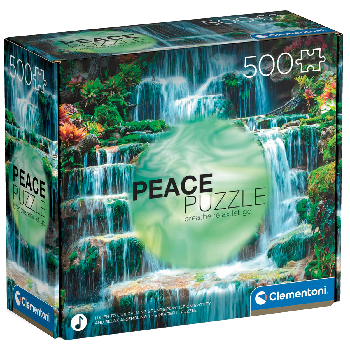 Wunderschönes High Quality Puzzle Peace von eine idyllische Landschaft einer Wasserfalls in Grünen. Bestehend aus 500 Teilen. Höre die beruhigende Playlist (Musik) auf Spotify und entspanne dich beim Zusammensetzen dieses Puzzles.