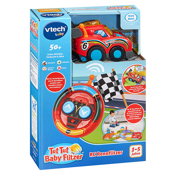 Auf die Plätze, fertig, los! Ferngesteuerter Tut Tut Baby Flitzer-Rennwagen, der vorwärts und rückwärts fahren kann. Eignet sich perfekt als Ergänzung, um mehrere Tut Tut Baby Flitzer auf der RC Autorennbahn (separat erhältlich) gegeneinander antreten zu lassen. Durch Drücken auf die leuchtende Gesichtstaste werden Sätze, Melodien und Geräusche ausgelöst. Spricht fröhliche Sätze, spielt kindgerechte Melodien und Lieder und macht lustige Geräusche. Reagiert auf die magischen Sensoren der Tut Tut Baby Flitzer-Spielsets (separat erhältlich). Fördert die motorischen Fähigkeiten und animiert zum Rollenspiel. 3 gesungene Lieder und 6 Melodien. Kindersicheres Batteriefach und Abschaltautomatik. Demobatterien sind enthalten.