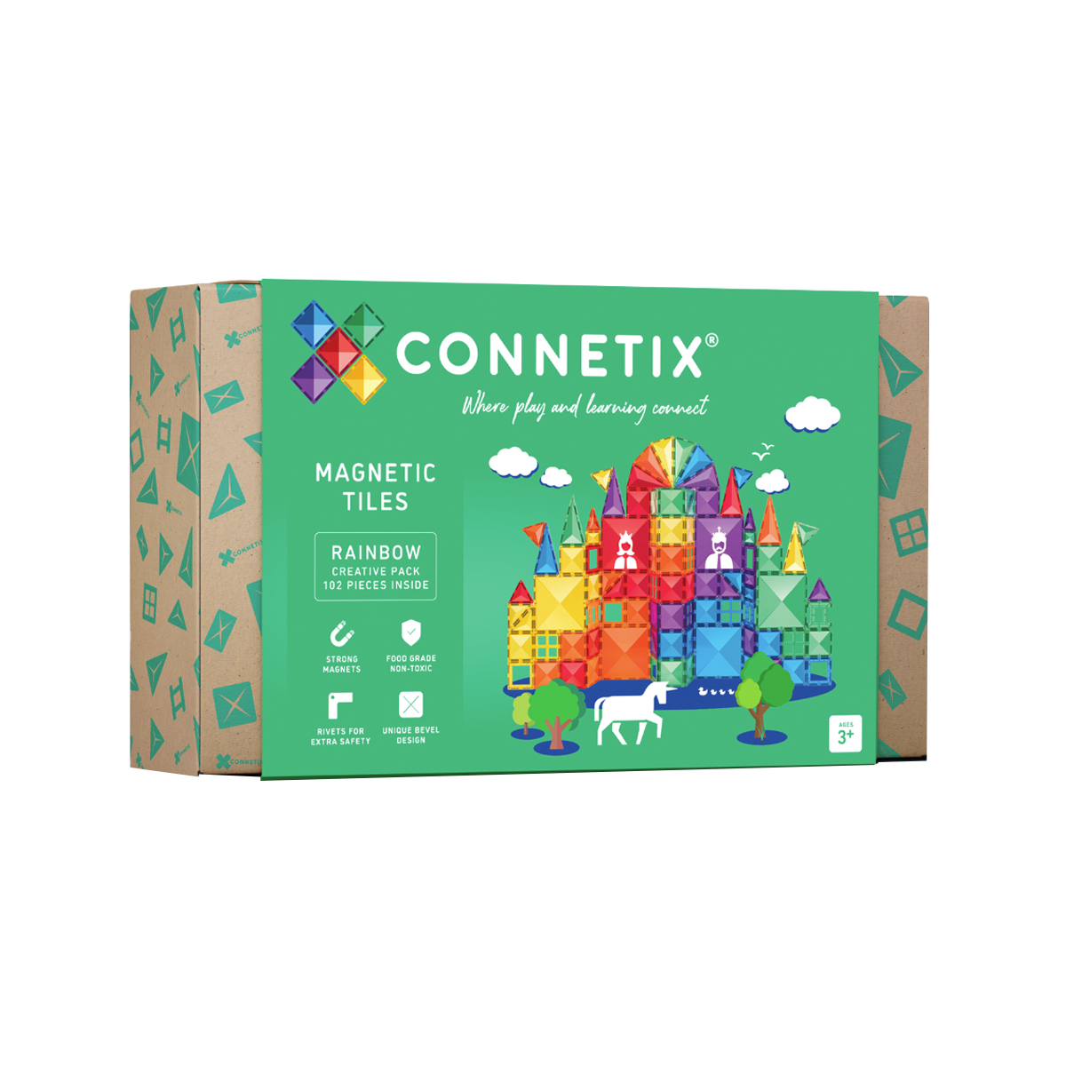 Mit dem Connetix 102-teiligen Regenbogen-Kreativset sind stundenlanger kreativer Spielspaß und freies Spielen garantiert! Das Set bietet unzählige Möglichkeiten für kreatives und spielerisches Lernen und enthält eine Vielzahl magnetischer Bausteine ??in allen Regenbogenfarben, darunter kleine und große Quadrate, gleichseitige, rechtwinklige und gleichschenklige Dreiecke sowie Zäune, Fenster und Türrahmen! Es ist der ideale Einstieg für gemeinsame Familienspiele und den Bau größerer Connetix-Kreationen! Ob allein oder mit Freunden und Familie, das Kreativset fördert die Entwicklung von MINT-Fächern (Mathematik, Informatik, Naturwissenschaften und Technik), die Fein- und Grobmotorik. Kinder können größere Burgen und Raketen, hohe Mauern, Kugelbahnen und Münzrutschen, Brücken und Türme bauen, Muster und Formen entdecken, Farbsortierboxen gestalten und vieles mehr. Das Connetix Creative Pack fördert zudem Ausdauer und Belastbarkeit, indem Kinder größere Konstruktionen entwerfen und so die Grenzen ihrer Vorstellungskraft austesten. Offene Spielzeuge helfen nicht nur, die Fantasie und Kreativität eines Kindes zu entwickeln, sondern wachsen auch mit ihm mit, während es lernt, sich entwickelt und sein Spiel immer komplexer wird.