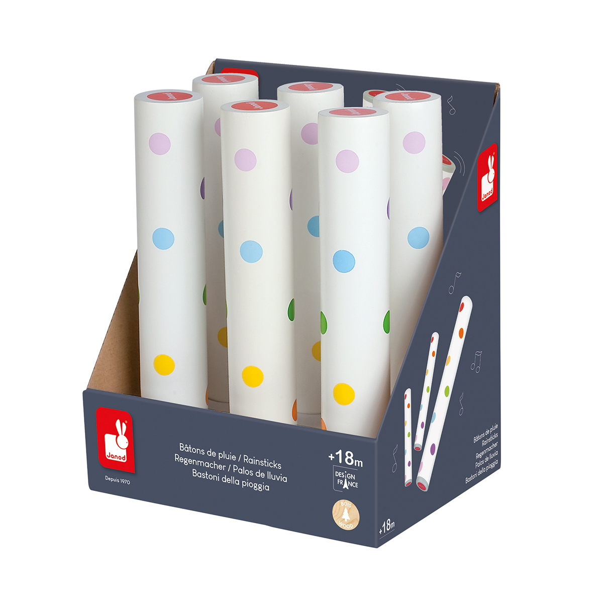 Ein farbenfrohes Holzspielzeug 4.5x4.5x26.6cm, das Kinderaugen zum Strahlen bringt. Dreht man den Regenmacher langsam um, hört man die Perlen langsam nach unten gleiten - als ob es regnen würde.