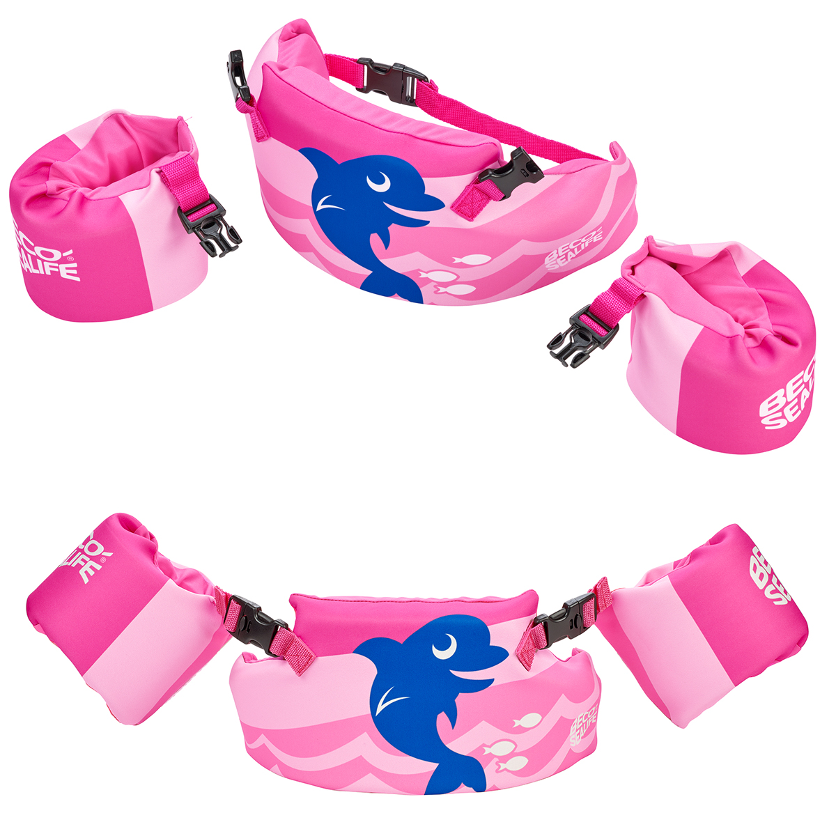 Schwimm-Lern-Set bestehend aus Schwimmhilfen und Schwimmgürtel, die mit einem Sicherheitsverschluss kombiniert werden (auch einzeln anwendbar). Das Set garantiert den richtigen Auftrieb an der optimalen Position. Für Kinder von 2 bis 6 Jahren und einem Körpergewicht von 15 bis 30 kg. Zertifiziert nach den aktuellen europäischen Sicherheitsrichtlinien EN13138-1:2014. ACHTUNG: Kein Schutz vor Ertrinken. Nur unter Aufsicht eines Erwachsenen verwenden!!!