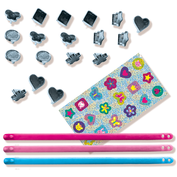 Bist du bereit deinen eigenen Schmuck zu basteln? Klebe einfach die glänzenden Glitzersticker auf die Anhänger und schiebe sie auf eines der drei Plastikarmbänder. Kombiniere deine eigenen Kombinationen, ziehe sie ab und kreiere etwas Neues! So kannst du jeden Tag ein anderes Design an deinem Handgelenk haben.