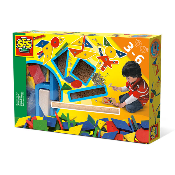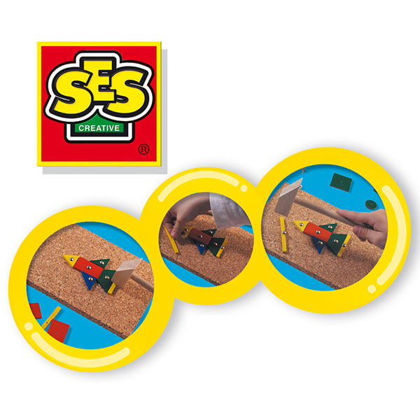 Hämmerchen Tick - Klassik von SES. Das klassische Hammer und Nagelspiel für die ganz Kleinen: 32 verschiedene geometrische Formen müssen in die Korkplatte gehämmert werden. Dabei entstehen die tollsten Figuren und Formen in den verschiedensten Farbkombinationen. Und das kann man beliebig oft wiederholen. Ideal zum Kombinieren mit Artikel 00926 - Hämmerchen Tick -Fantasie. Inhalt: Korkplatte, Holzhammer, Metallnägel, 32 geometrische Holzformen, Bildvorlagen. Für Kinder ab 3 Jahren.