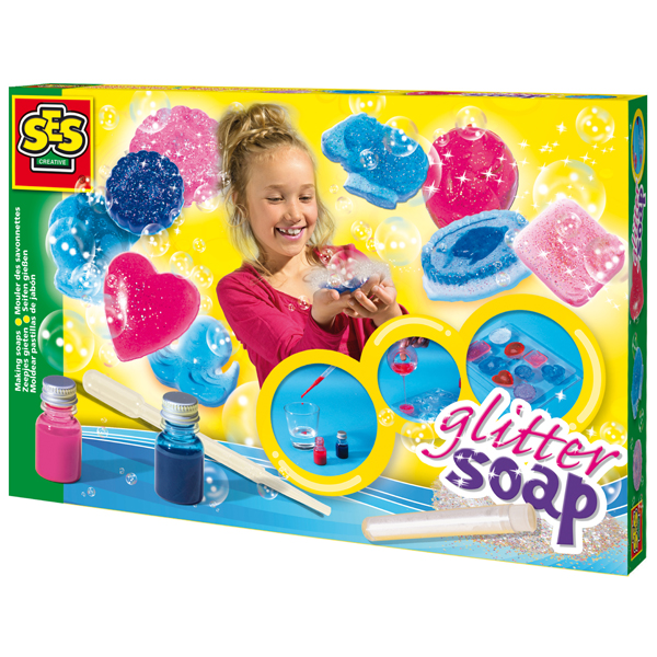 Seifen giessen mit SES. Giesse Deine eigene Seife. Aus dem beiliegenden Seifenstück einen Teil abschneiden und in der Microwelle erhitzen. Die flüssige Seife mit den mitgelieferten Farben nach eigenem Gefallen einfärben und mit Glitzer verschönern. Anschliessend in die Form giessen und im Kühlschrank fest werden lassen. Inhalt: 150 gr. Rohseife, 9 verschiedene Giessformen, Duftfarbstoffe, Glitzer, Pipette, Anleitung. Für Kinder ab 7 Jahren.