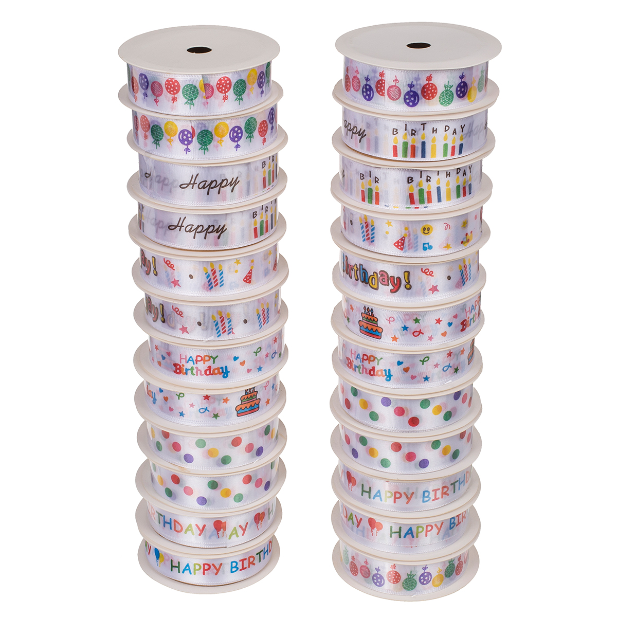 Schleifenband Happy Birthday 6-fach sortiert, 2 cm x 2 m 100% Polyester