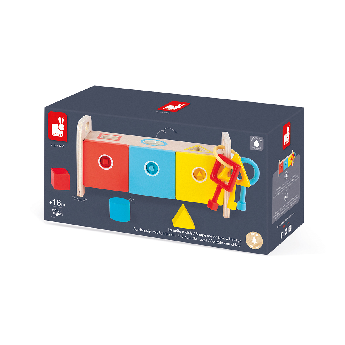 Dieser Schlüsselkasten ist ideal, um auf spielerische Weise die Geschicklichkeit des Kindes zu fördern. Um die Türchen zu öffnen und die Klötzchen im Kasten herauszunehmen, muss es den zum jeweiligen Schloss passenden Schlüssel auswählen. Sehr clever! Die Rückseite des Kastens ist durchsichtig, sodass das Kind die Anzahl und Form der Klötzchen, die in den Kasten gesteckt wurden, sehen kann. Praktisch! Der magnetische Schlüsselbund lässt sich am Griff befestigen, damit die Schlüssel nicht verloren gehen. Im Lieferumfang enthalten sind 6 Klötzchen (1 gelbes Dreieck, zwei blaue Kreise, 3 rote Quadrate) und 3 Schlüssel aus Kunststoff. Wasserfarben. Dieses Produkt fördert: Hand-Augen-Koordination und Beziehung von Ursache und Wirkung.