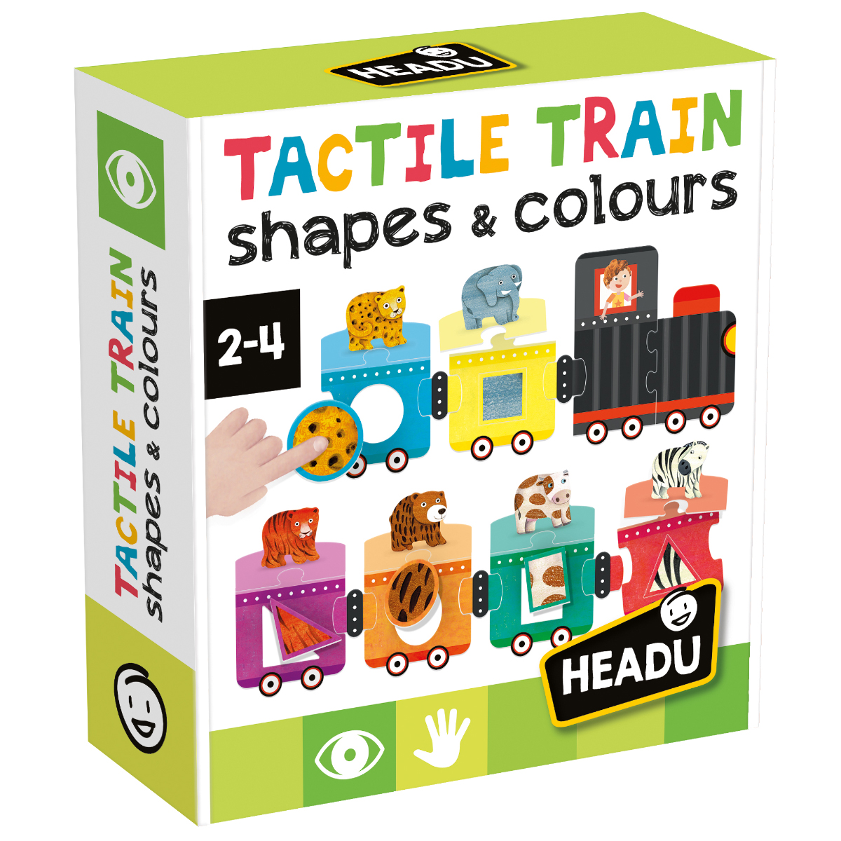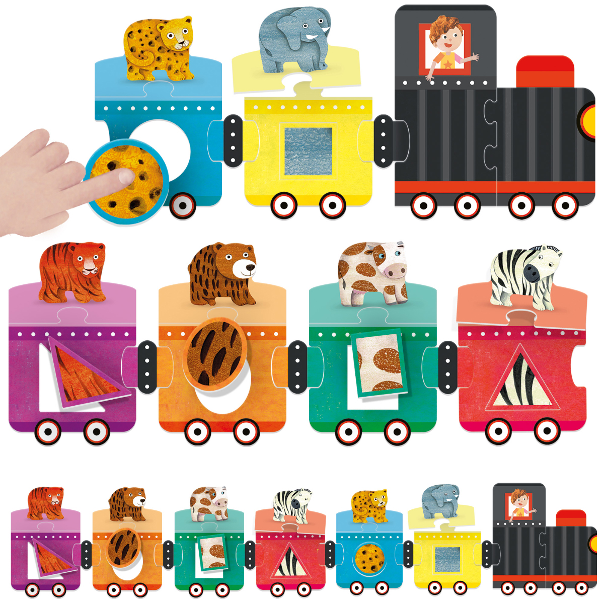 Ein fröhlicher Tastzug mit einem Lernsystem, das kleinen Kindern hilft, grundlegende Formen und Farben sowie, mithilfe der freundlichen Tiere, verschiedene Farbtöne zu erkennen. Formen und Farben, Feinmotorik, Hand-Augen-Koordination, Naturalistische Sensibilität, Primäre Intelligenz: visuell-räumlich, Weitere beteiligte Intelligenzen: körperlich-kinästhetisch, naturalistisch. Inhalt: 1 zweiteilige Lokomotive, 6 Waggons, 6 tierförmige Teile, 6 Mantelmusterformen, 6 selbstkorrigierende Verbindungsstücke