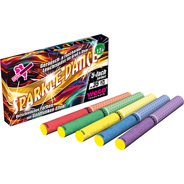 Sparkle Dance, 5 Stk. Hanfackeln, Geräusch und raucharm, verschiedene Farben in rot, grün, gelb, blau und violett. Mit Goldfunken-Effekt. Brenndauer ca. 35 Sekunden.