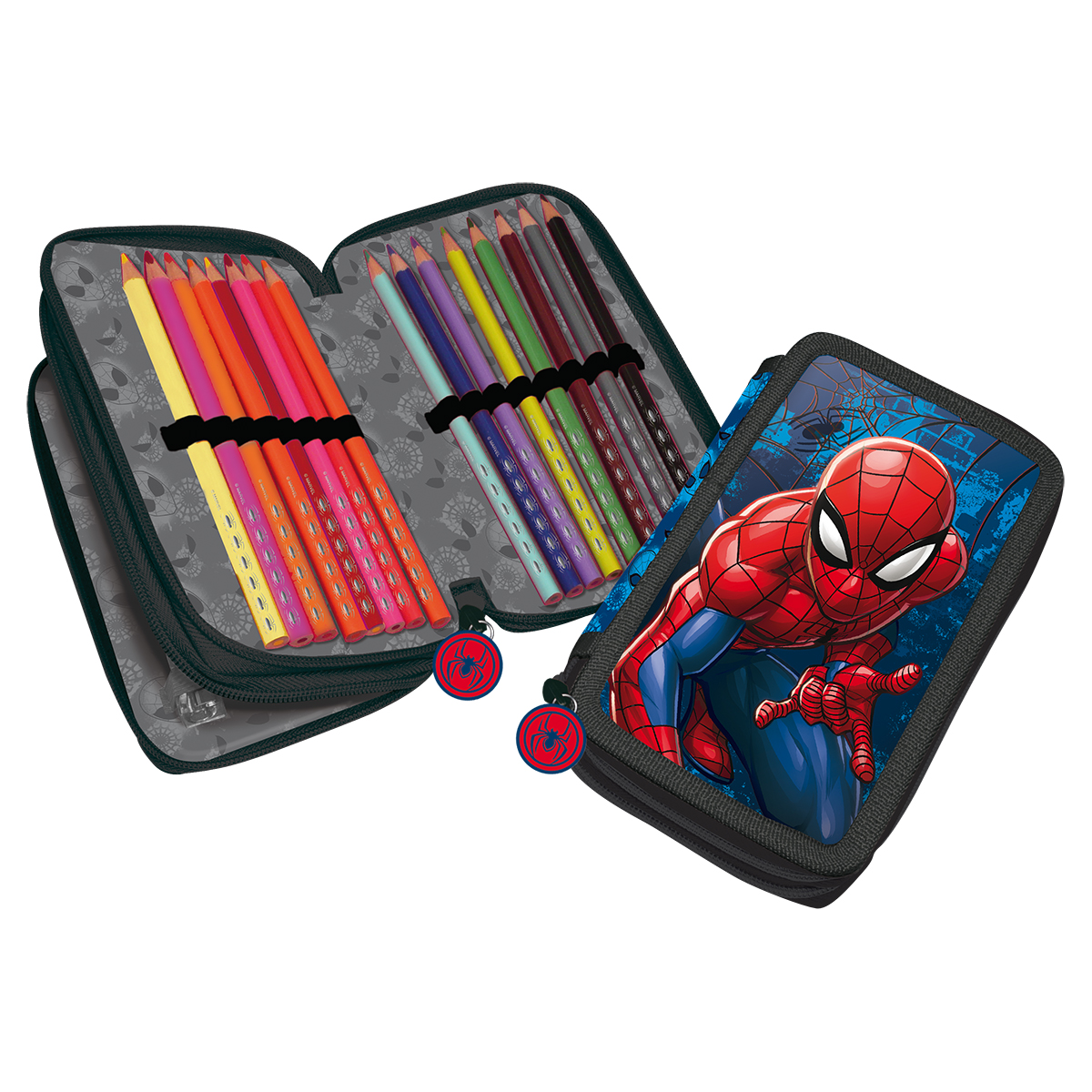 Gefülltes doppelstöckiges Federmäppchen, aus strapazierfähigem 300D-Nylon, 19.5x12.5x4 cm. Inhalt: 15cm Lineal mit 4-Farben-Aufkleber, 2 dreieckige, gespitzte Bleistifte, 1 Anspitzer, 1 Radiergummi, 1 Notizblock mit 20 Seiten, 16 dreieckige, gespitzte Buntstifte.