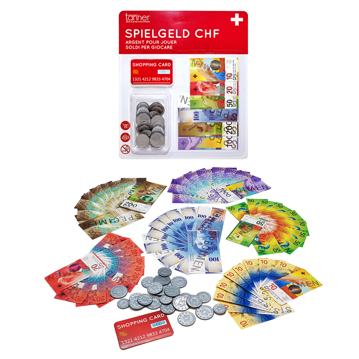 Spielgeld Franken und Euro. Auf dem Blister sind jeweils 15 Scheine à 6 Nennungen: 10, 20, 50, 100, 200, 1000 und eine Eurocard sowie 30 verschiedene Münzen.