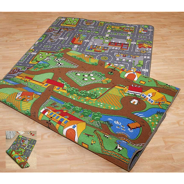 Wendespielteppich Duoplay. Ein Highlight für jedes Kinderzimmer. Ob in der City oder auf der Farm, hier sind die Phantasien der Kinder grenzenlos. Masse: 100 x 190 cm. Material: 100% Polyester.