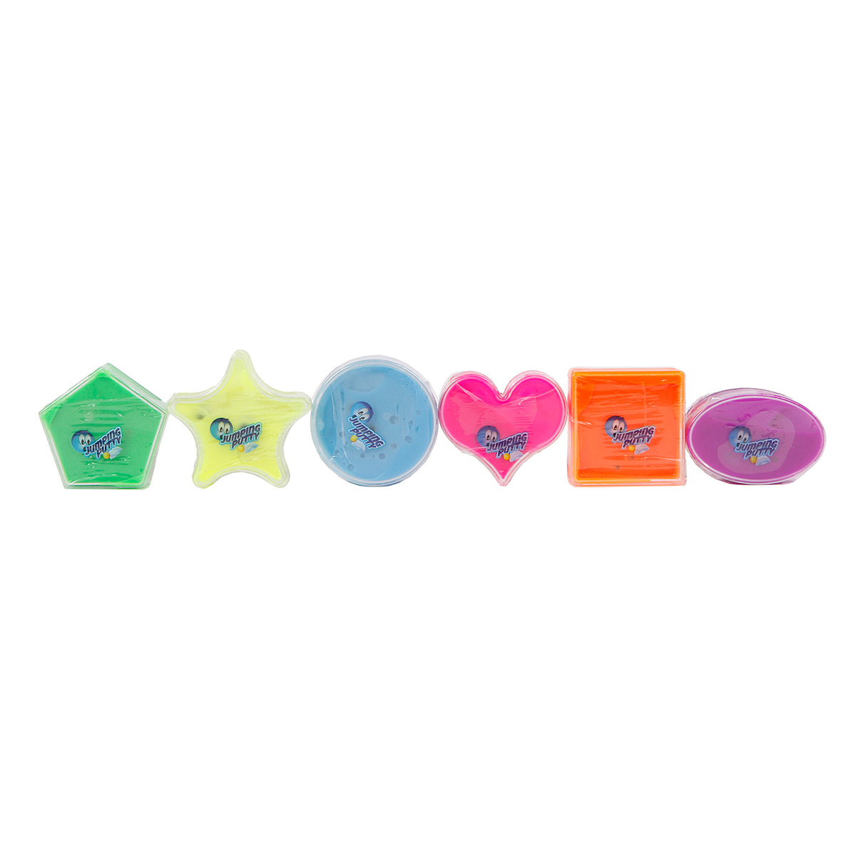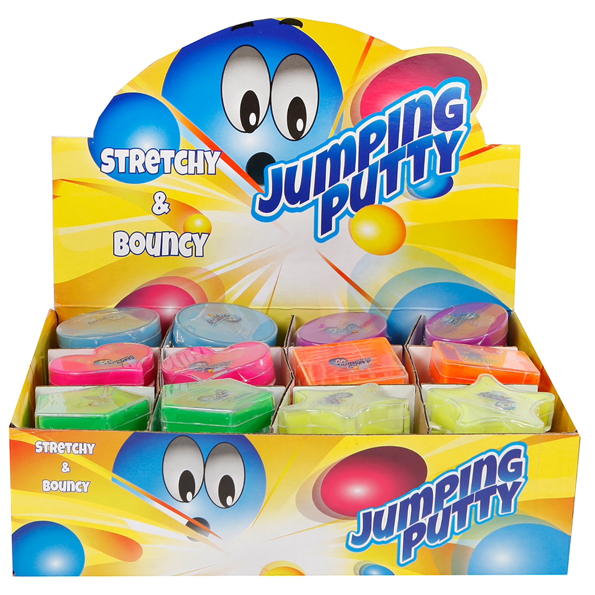 Diese lustige Spring Knete kommt in vier verschiedenen Farben in einem bunten Verkaufsdisplay à 48 Stück geliefert.