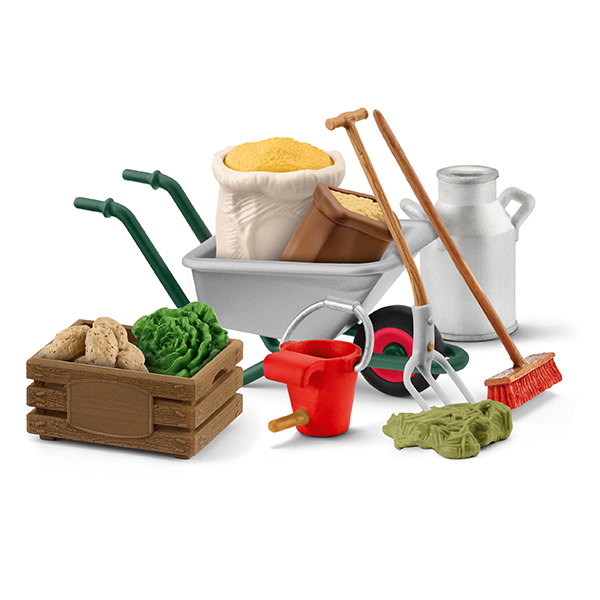 Im liebevoll gestalteten Stallpflege Zubehör von Schleich® findet sich Futter für alle Bauernhoftiere. Das Pferd bekommt den Hafer, die Schweine freuen sich über Kartoffeln und Salat. Das Kälbchen bekommt noch Milch in seinem Eimer mit Trinkvorrichtung. Das Heu für die Kühe spiesst der Bauer mit der Heugabel auf und bringt es mit der Schubkarre zu den Tieren.