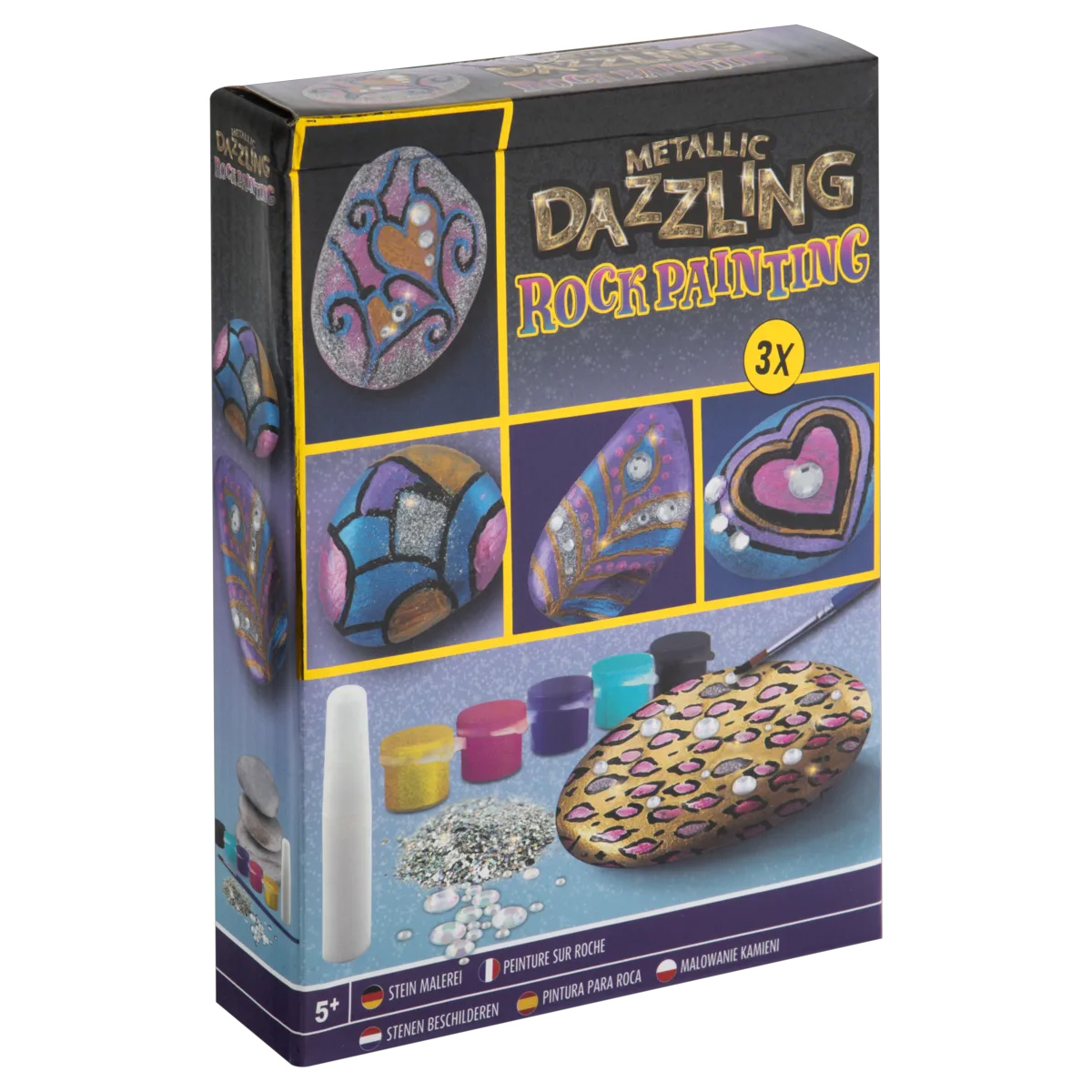 Steine anmalen mit 3 Steinen, 5 Farben, Glitter und Pinsel. Alter 5+.