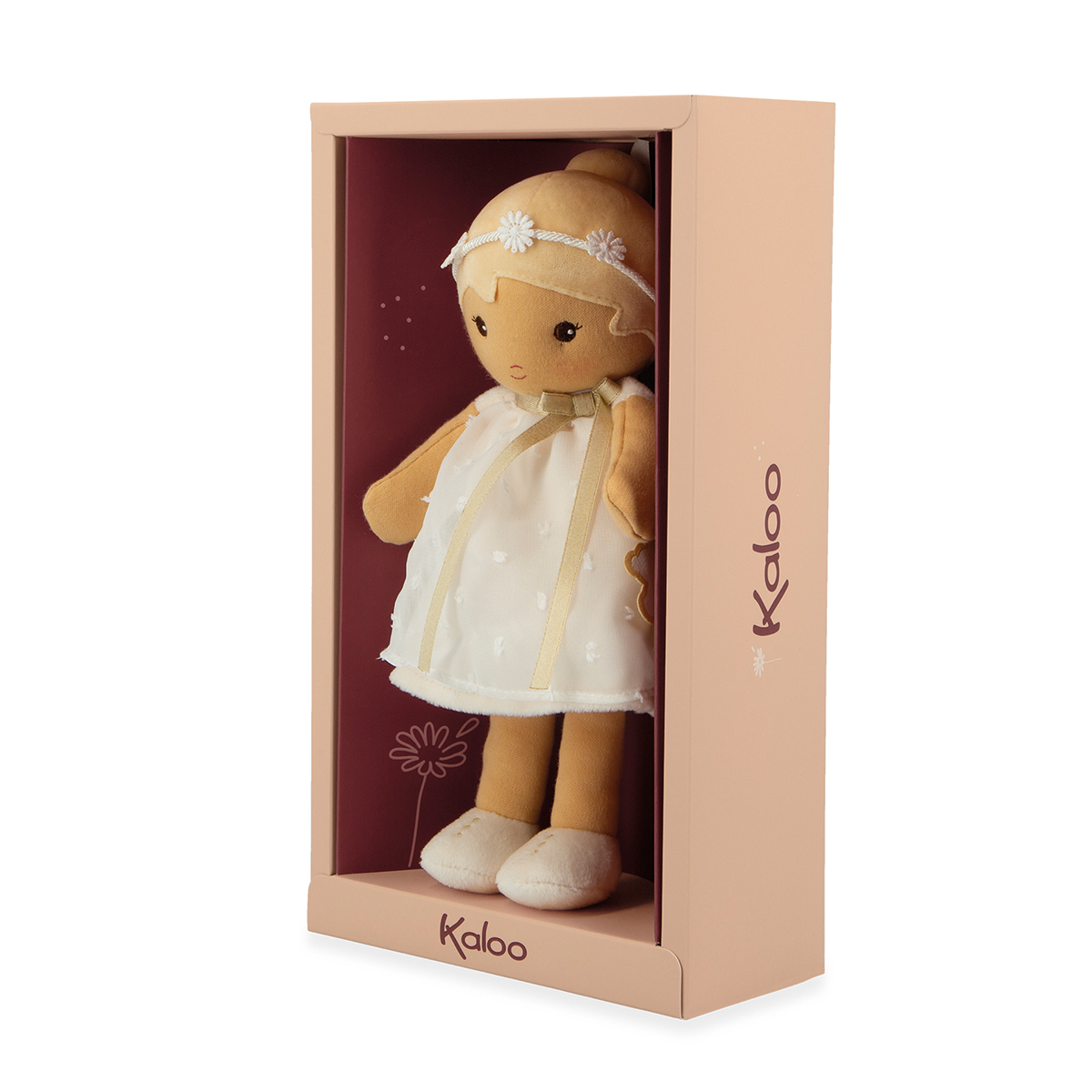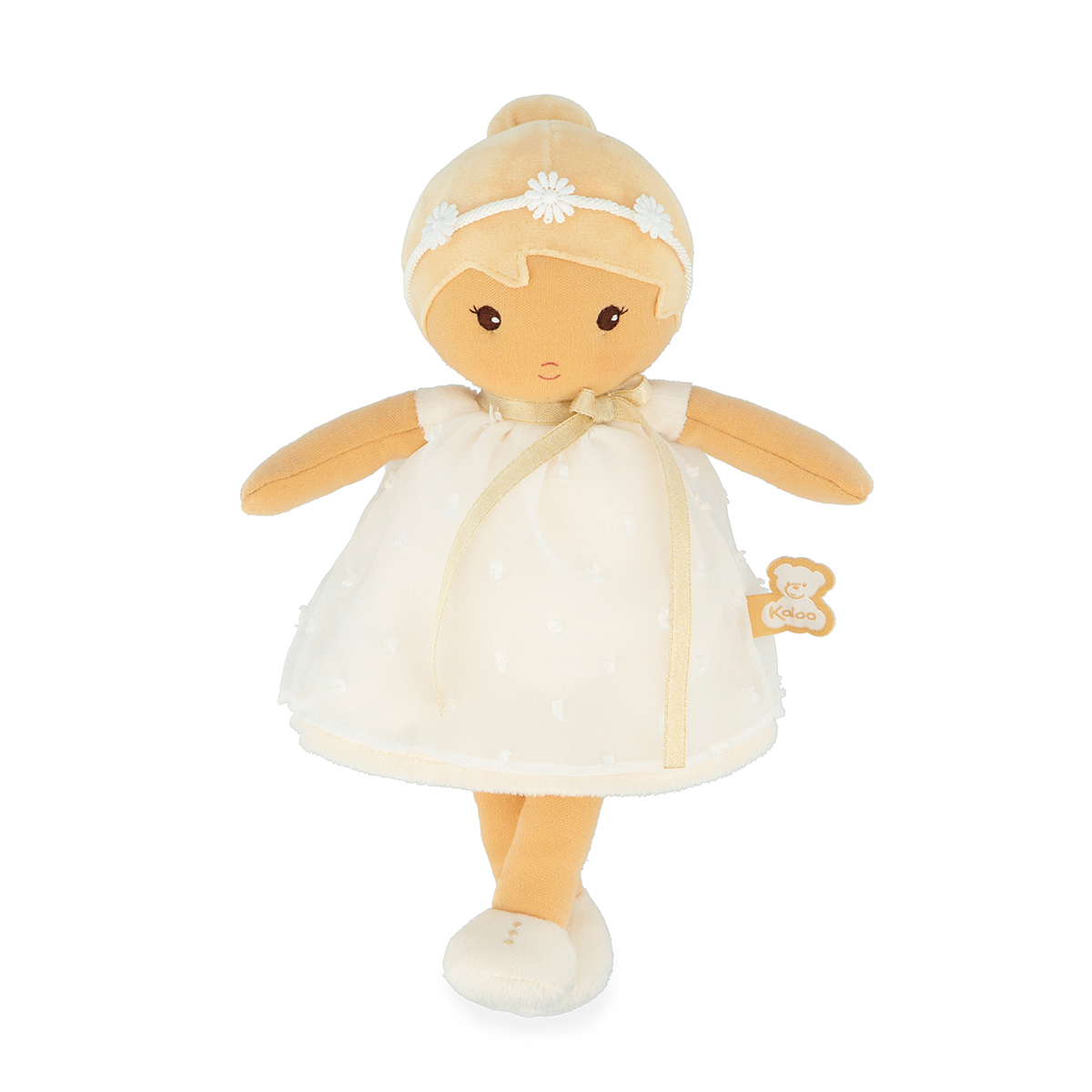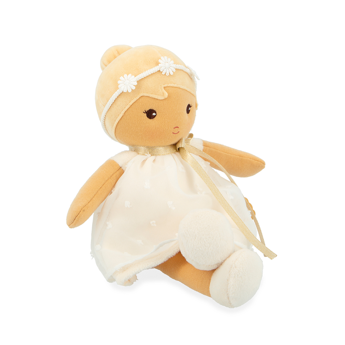 Daphné ist eine elegante 25 cm grosse Stoffpuppe. Sie wurde mit Sorgfalt für besondere Anlässe eingekleidet. Daphné trägt ein zartes weisses Kleid aus Organza, so luftig-leicht wie eine sanfte Brise, perfekt für eine Taufe oder eine Feier. Eine Blumenkette schmückt ihren Kopf und verleiht ihr eine poetische Note, während ihre hübschen Schuhe ihr elegantes Outfit abrunden. Daphné verkörpert die Reinheit und Süsse kostbarer Momente. Still und verträumt liebt sie ruhige Momente und zärtliche Gesten wie das Streicheln des Windes. Dank ihrer kleinen Grösse kann diese Puppe Baby überallhin begleiten. Für eine individuelle Note ist ein Band auf ihren Rücken genäht, auf das der Babyname geschrieben werden kann. Besteht mindestens zu 80 % aus recyceltem Füllmaterial. Bei 30 °C in der Maschine waschbar. Ab Geburt.