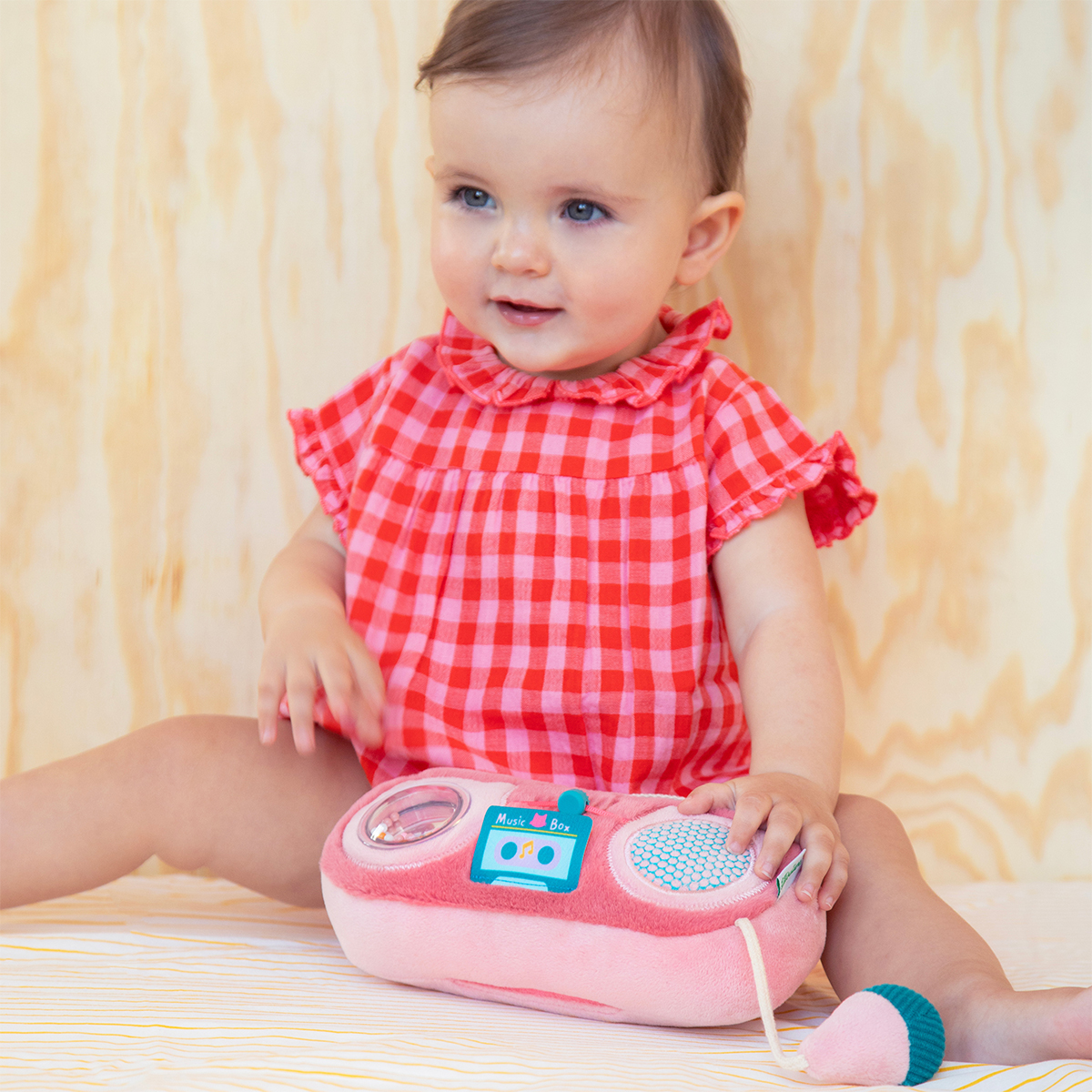 Ein lustiges kleines Stoffradio zur Anregung der Sinne des Babys! Beim Spielen gibt es fröhliche Geräusche von sich, die die Aufmerksamkeit wecken und das Gehör fördern. Weich und originell in seiner Form lädt dieses Radio das Baby ein, zu entdecken, seine Sinne zu entwickeln und seiner Fantasie freien Lauf zu lassen. Das Soundmodul verfügt über einen EIN/AUS-Schalter und kann zum einfachen Waschen in der Maschine herausgenommen werden.