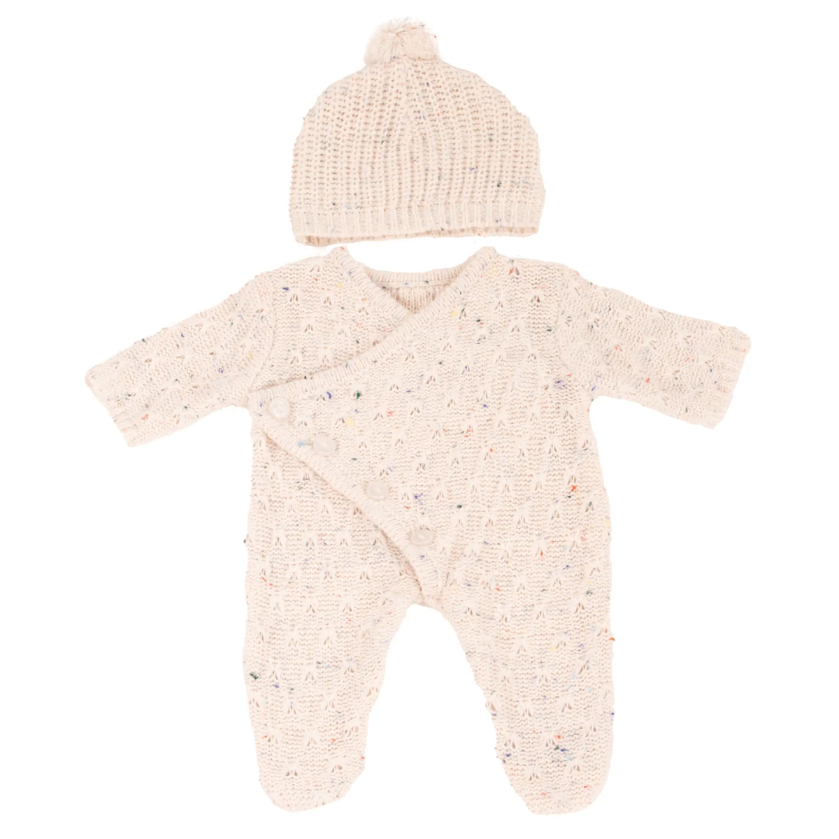 Was für ein zauberhafter Strickanzug mit Wickeloberteil, perfekt für kleine Babypuppen. Dieser edle Anzug kombiniert stilvolles Design mit Bequemlichkeit. Die dazu passende Bommelmütze rundet den Look ab und hält die Puppe warm. Ideal für kalte Tage und ein wunderbares Geschenk für kleine Puppeneltern.