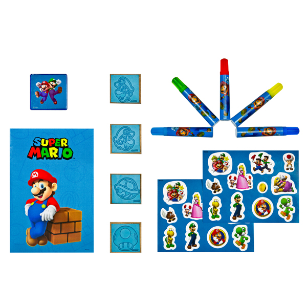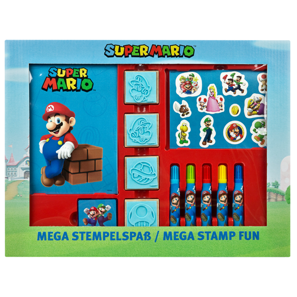 Super Mario Stampelspass mit 4 grosse Stempel, Stempelkissen, 5 Fasermaler, Stickerblatt und Malheft.