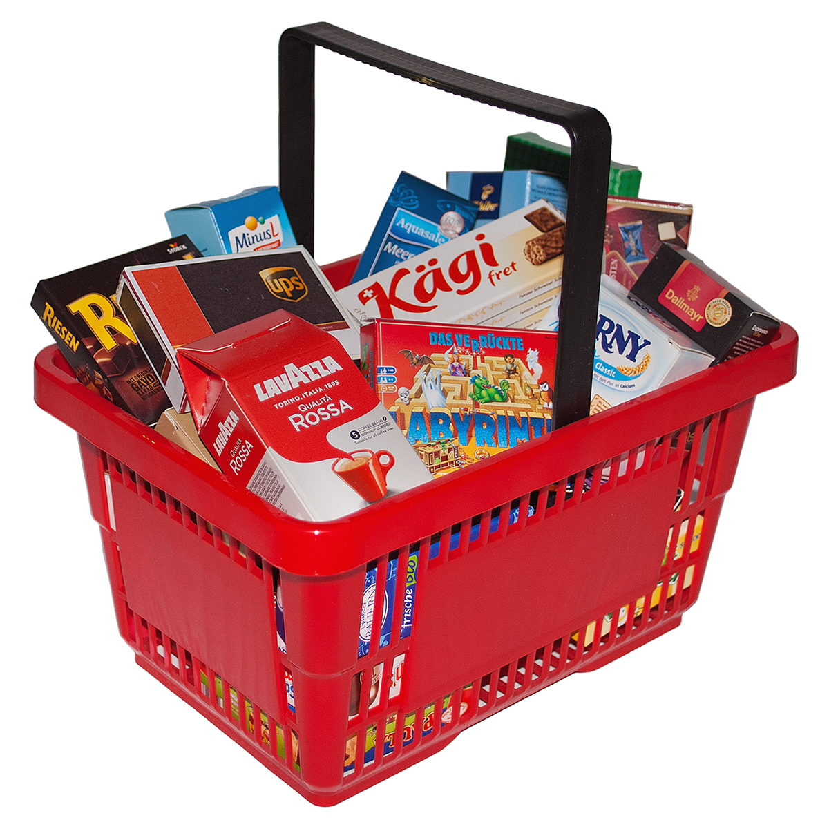 Supermarkt-Korb gefüllt 23x15.5x12cm. Der rote Supermarkt Korb ist gefüllt mit hochwertigen Miniaturfaltschachteln namhafter Hersteller.