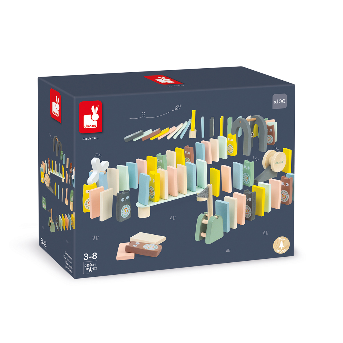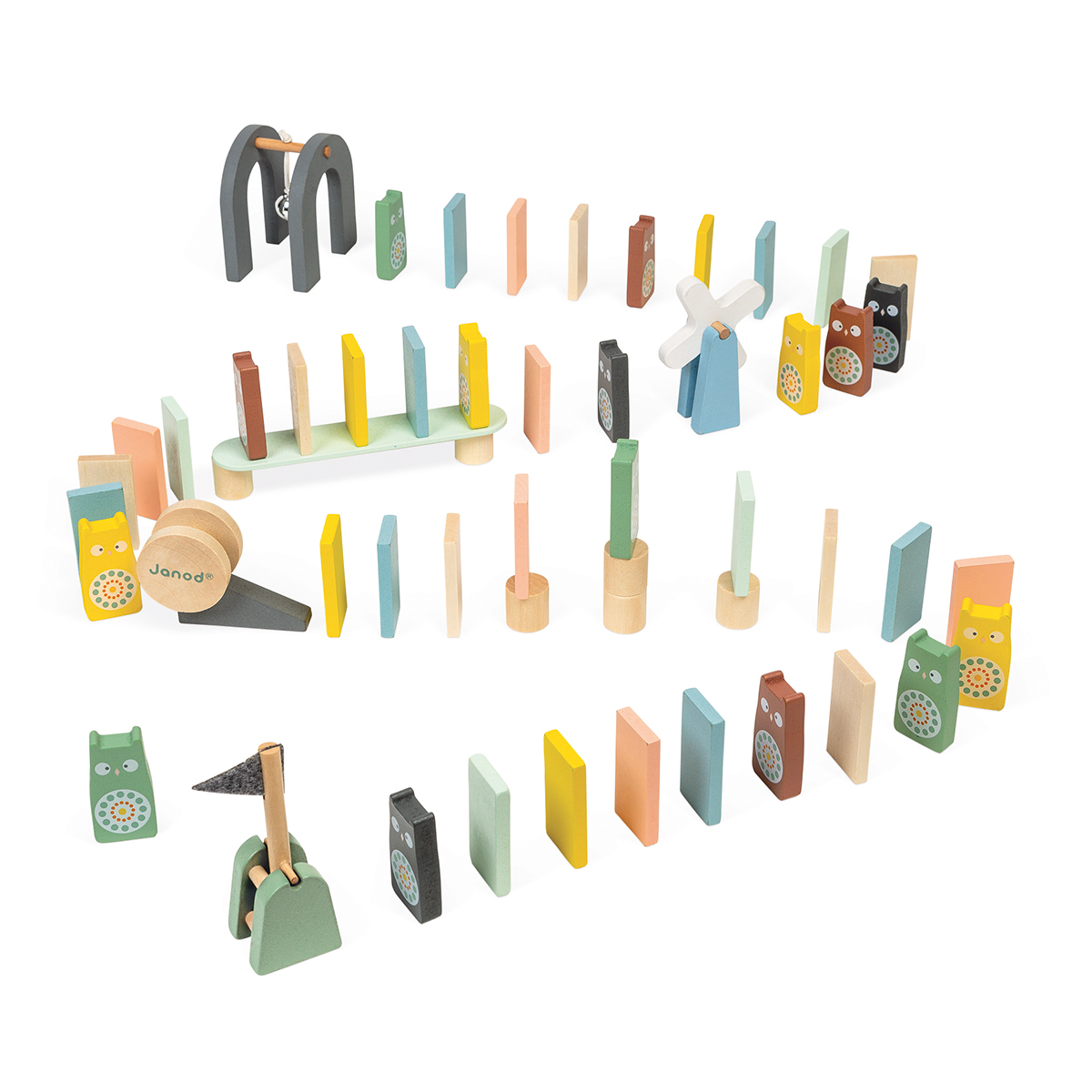 100 Teile zum Bauen eines Hindernis-Parcours aus Dominosteinen für unsere hübschen Eulen-Figuren (Klötze, Brücken, Windmühlen, Fahnen, Glöckchen, Gefälle und Spulen). Ideal für die Entwicklung der Geschicklichkeit und Geduld Ihres Kindes auf spielerische Weise. Eine Produktreihe in trendigen dezenten Farben, um Ihr Kind bei seinen ersten Erfahrungen liebevoll zu begleiten! Wasserfarben. Holz: Holzfaser. Verpackt im Karton.