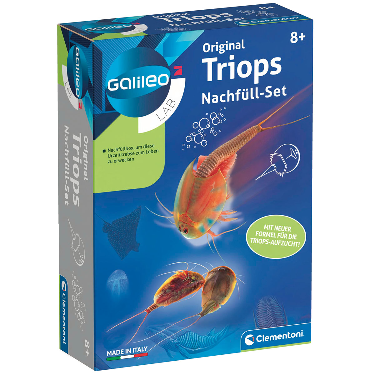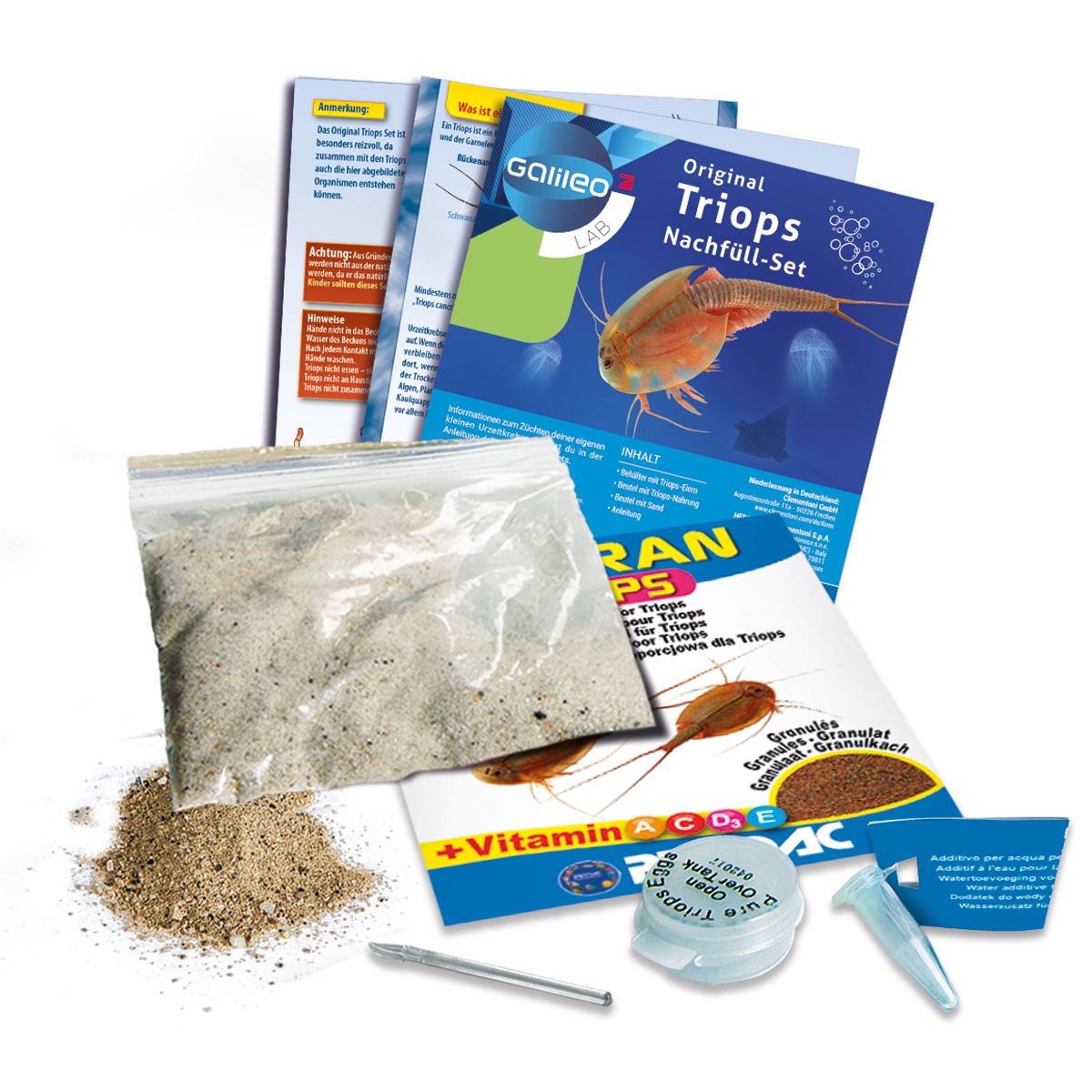 Nachfüllset zu den Triops Experimentierkästen. Enthält Triops-Eier, Triops-Nahrung und Sand zur Aufzucht dieser faszinierenden Urzeitkrebse, die bis in unsere Tage überlebt haben.