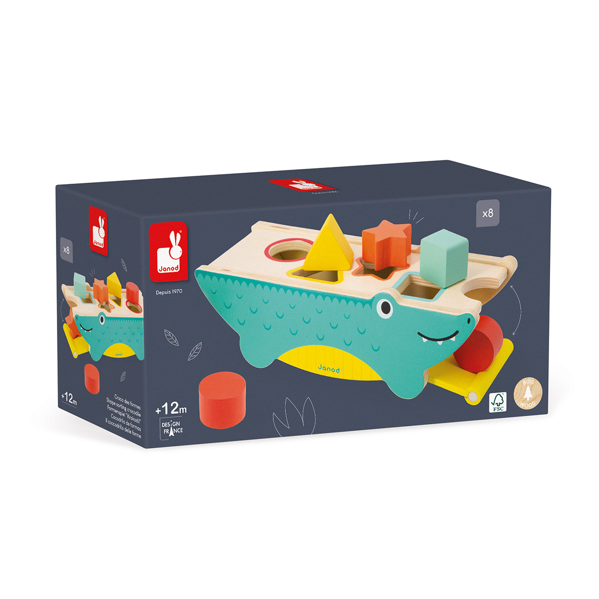 Oh, was für ein schönes Krokodil! Auf seinem Rücken lerntdas Kind anhand der 8 einsetzbaren Teile Formen und Farben kennen. Um dem Kind zu helfen, die Formen wiederzuerkennen, ist die Kontur jedes Lochs in der Farbe des entsprechenden Teils markiert. Und holen wir die Teile aus dem Krokodil heraus? Nichts einfacher als das: Der Mund des Krokodils lässt sich weit öffnen, damit die Teile herausgenommen werden können. Das ideale Spielzeug zur Entwicklungder Hand-Augen-Koordination. Spielzeug aus Holz, bemalt mit Farbe auf Wasserbasis. Lernspielzeug für Kinder ab 12 Monaten.