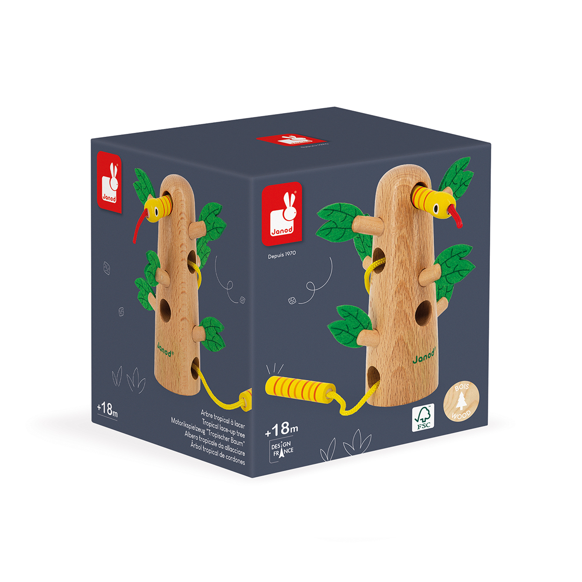 Ssss ssss ... Tief im Dschungel versteckt sich die Schlange. Ihr Kind wird der Schlange helfen, den Baumgipfel zu erreichen. Einfach durch die verschiedenen Löcher im Baumstamm führen, damit sie schnell den Baum hochklettern kann. Dieser Fädel-Baum fördert die Konzentration und Entwicklung der Feinmotorik. Spielzeug aus Holz, bemalt mit Farbe auf Wasserbasis. Lernspielzeug für Kinder ab 18 Monaten.