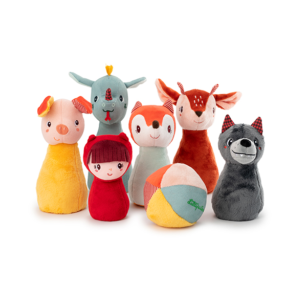 Wer kann diese fröhliche Bande von Waldfreunden mit einem Wurf umwerfen? Dieses bunte Bowling-Spiel besteht aus 6 weichen Pins und einem weichen Stoff-Rasselball. Um drinnen ohne Schäden zu spielen und ein zukünftiger Bowling-Star zu werden.