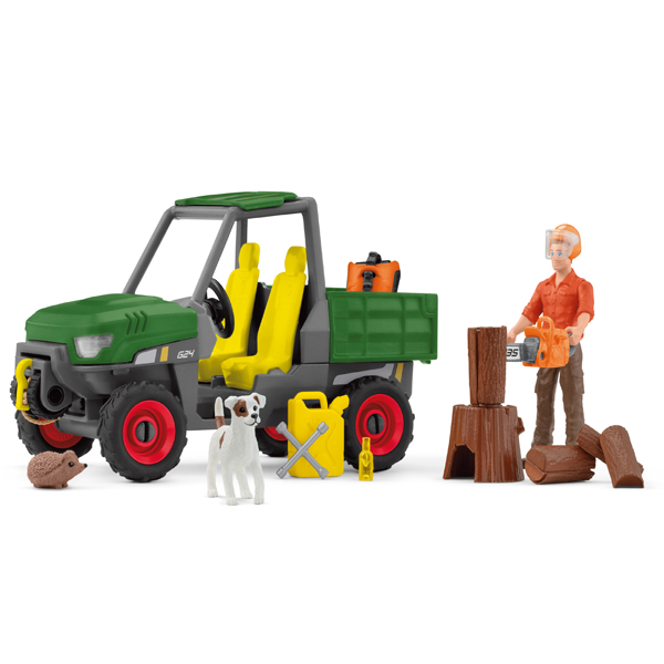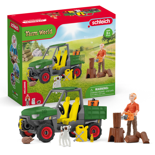 Bauer Paul muss im Wald Holz machen, bevor der Winter kommt. Dazu fährt er mit dem Geländewagen in den Wald zu den gefällten Bäumen. Mit der Seilwinde zieht er einen schweren Baumstamm vom Stapel. Er setzt den Schutzhelm auf und zersägt mit der Motorsäge den Stamm. Sein Jack-Russell-Terrier passt auf, dass er nichts verkehrt macht. Als er endlich fertig ist, trinkt er durstig Limonade. Nanu? Wer lugt denn da neugierig aus dem Gebüsch hervor? Der Igel ist von der Futterkrippe (separat erhältlich) herübergekommen und beobachtet ihn!