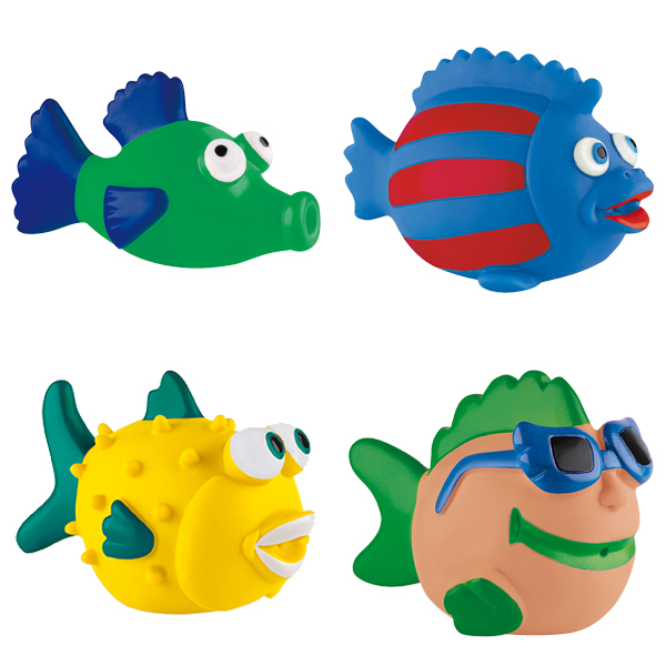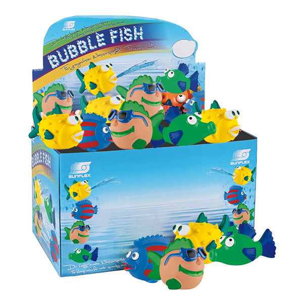 Die Wasserspritztiere sunflex BUBBLE FISH haben eine kleine Öffnung, aus der Wasser gespritzt wird. Zum Spielen und Plantschen. Grösse: ca. 10 cm, 4 Motive sortiert in einem praktischen 40 Stk. Display.