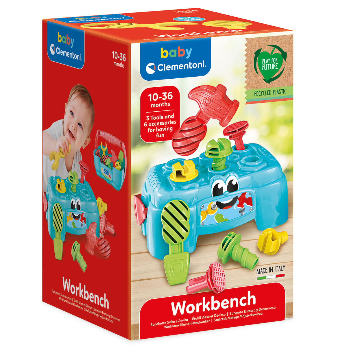 Eine Werkbank mit Hammer, Schraubendreher, Schraubenschlüssel, Nägel, Bolzen und Schrauben lässt die Herzen kleiner Baumeister höher schlagen. Die Werkbank wird zu einer praktischen Werkzeugbox, die überall hin mitgenommen werden kann. Die Hand-Auge-Koordination und die manuellen Fähigkeiten werden gefördert.