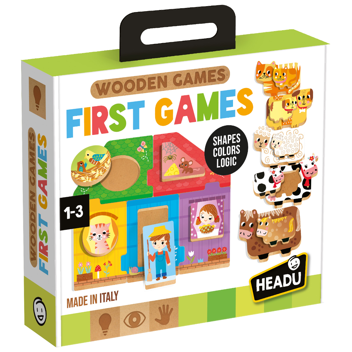 Formen, Farben und erste logische Fähigkeiten! Eine originelle und unterhaltsame Kollektion pädagogisch wertvoller Holzspielzeuge. Dazu gehören ein Formen- und Farbenhaus, stapelbare Muttertiere mit ihren Babys sowie bezaubernde Zuordnungsspiele. Die Spiele sind selbstkorrigierend und mit speziell für Kleinkinder entwickelten Haken ausgestattet. Förderung der frühen logischen Fähigkeiten, Formen und Farben erkennen, Feinmotorik. Primäre Intelligenz: logisch-mathematisch. Weitere Intelligenzen: visuell-räumlich und körperlich-kinästhetisch. Inhalt: Haus mit 5 geometrischen Formen, 5 Tiere mit je 5 Babys, 1 Traktor mit Anhänger und 1 kleiner Baum