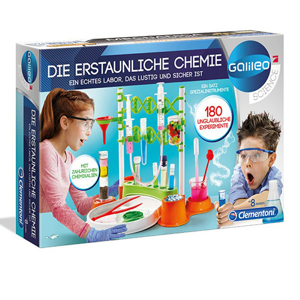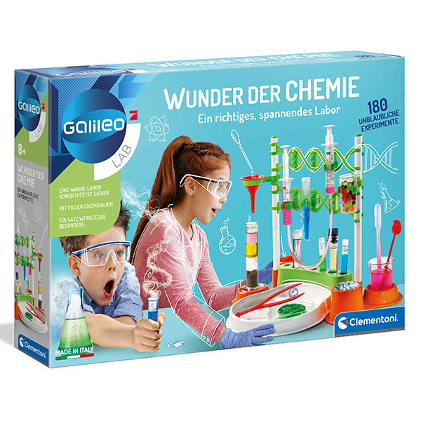 Galileo Wunder der Chemie. Ein Set für verblüffende Chemie-Experimente! Ein Labor für angehende Wissenschaftler, um über 180 Experimente durchzuführen und die Geheimnisse der Chemie absolut sicher zu entdecken. Das Set enthält viele Substanzen, um mit erstaunlichen chemischen Reaktionen zu experimentieren und unglaubliche Effekte zu erzielen! Alle Experimente werden anhand von Bildern mit klaren und detaillierten Erklärungen beschrieben und in einer Bedienungsanleitung zusammengefasst, die die Chemie zu einem unterhaltsamen Spiel macht.