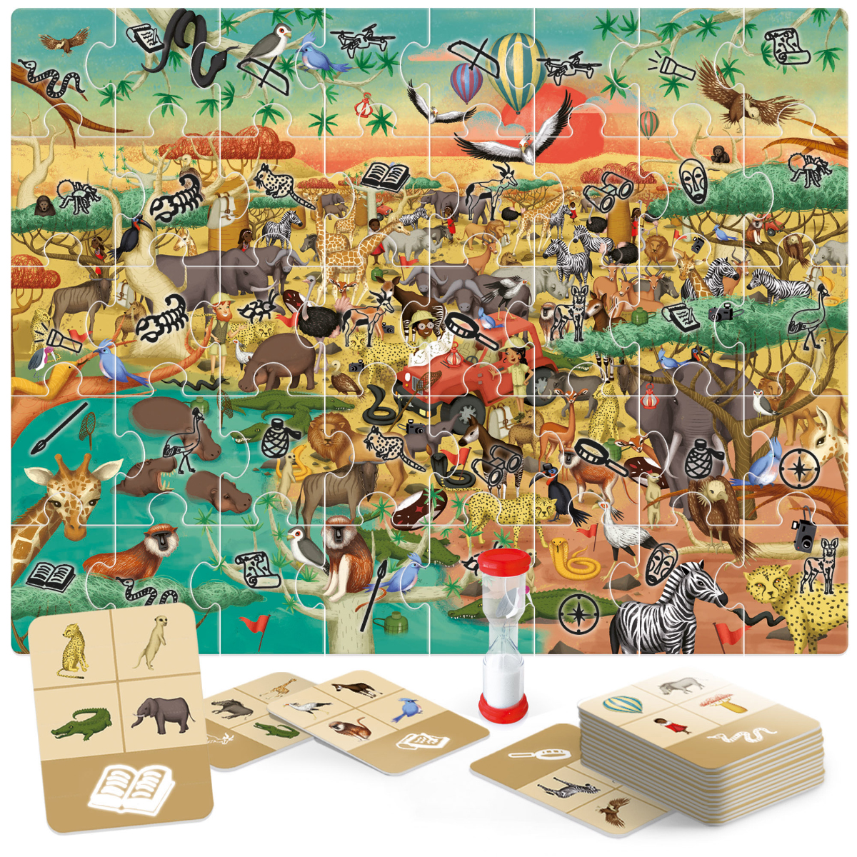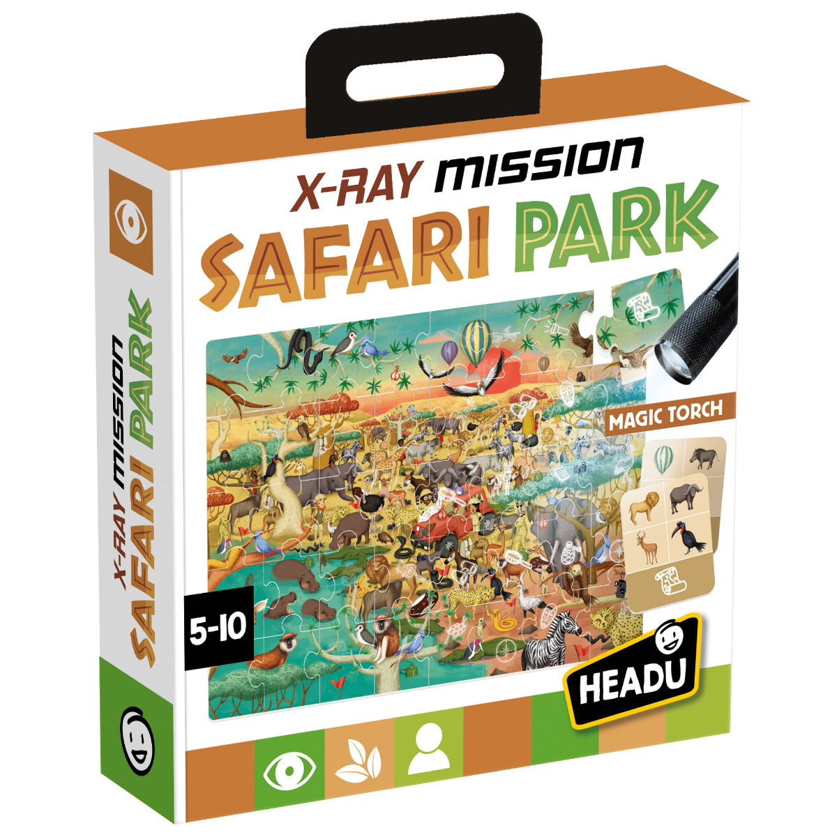 Fordere deine Freunde in dieser superlustigen Röntgen-Safari heraus! Zahlreiche Missionen erfordern scharfe Beobachtungsgabe, ein gutes Gedächtnis und volle Aufmerksamkeit. Dank der magischen Taschenlampe kannst du außerdem Dinge sehen, die dem bloßen Auge verborgen bleiben! Visuell-räumliche Fähigkeiten, Gedächtnis und Aufmerksamkeit, natürliche Sensibilität sowie Sozialisierung und Regelbefolgung. Primäre Intelligenz: visuell-räumlich. Weitere beteiligte Intelligenzen: natürliche und persönliche Intelligenz. Inhalt: 1 Puzzle mit 40 Teilen, 20 Missionskarten, 1 magische Taschenlampe (benötigt 3 AAA-Batterien 1,5 V, nicht enthalten), 1 Sanduhr und Anleitung