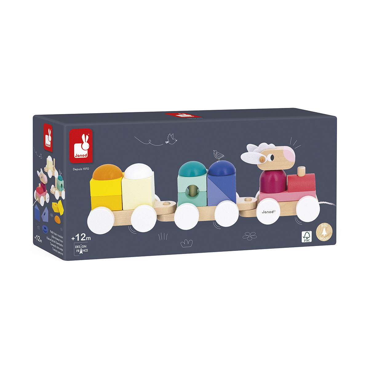 Tschu, Tschu! Volle Fahrt voraus mit der bunten Eisenbahn! Diese farbenfrohe Eisenbahn, die von einem niedlichen, schelmischen Schaf gefahren wird, ist sowohl Nachziehspielzeug als auch Konstruktionsspielzeug. Sie besteht aus einer Lokomotive und zwei stapelbaren Waggons mit 15 Holzteilen in verschiedenen Farben und Formen. Die Kinder können den Zug immer wieder auseinandernehmen und neu zusammensetzen, sich eigene Kombinationen ausdenken und ihre Kreation durch das ganze Haus fahren lassen. Das ideale Spielzeug, um die Grobmotorik zu trainieren und Formen und Farben zu lernen. Spielzeug aus Holz für Kinder ab 12 Monaten.