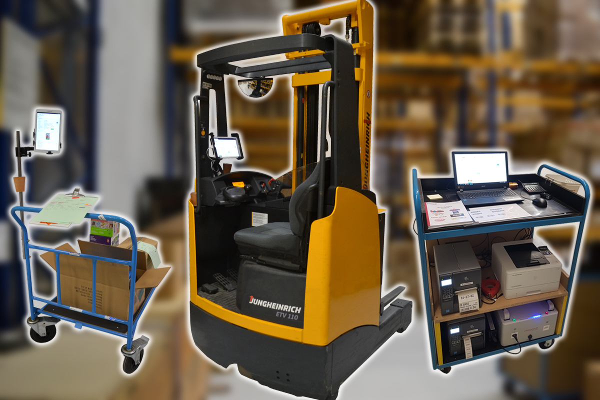 Im Bild oben links: Rüstwagen mit Tablet verfügt über massgeschneiderte Software, welche die Lagermitarbeitenden bei ihrer Arbeit unterstützt. Im Bild oben rechts: Batteriebetriebene, mobile Einheit zur Unterstützung bei Wareneingängen und Preisauszeichnung.
