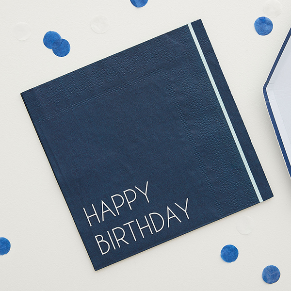 Serviettes en papier joyeux anniversaire. Fêtez votre anniversaire avec ces élégantes serviettes en papier bleu marine. Chaque paquet contient 16 serviettes d'anniversaire bleu marine. Faites ressortir votre vaisselle de fête avec ces serviettes en papier bleu marine. Ce design élégant sera incroyable lors de votre fête d'anniversaire. Combinez-le avec notre fantastique vaisselle d'anniversaire de notre gamme Mix It Up Navy! Chaque paquet contient 16 serviettes en papier mesurant 16,5 cm (H) x 16,5 cm (L). L'emballage est recyclable et certifié FSC.
