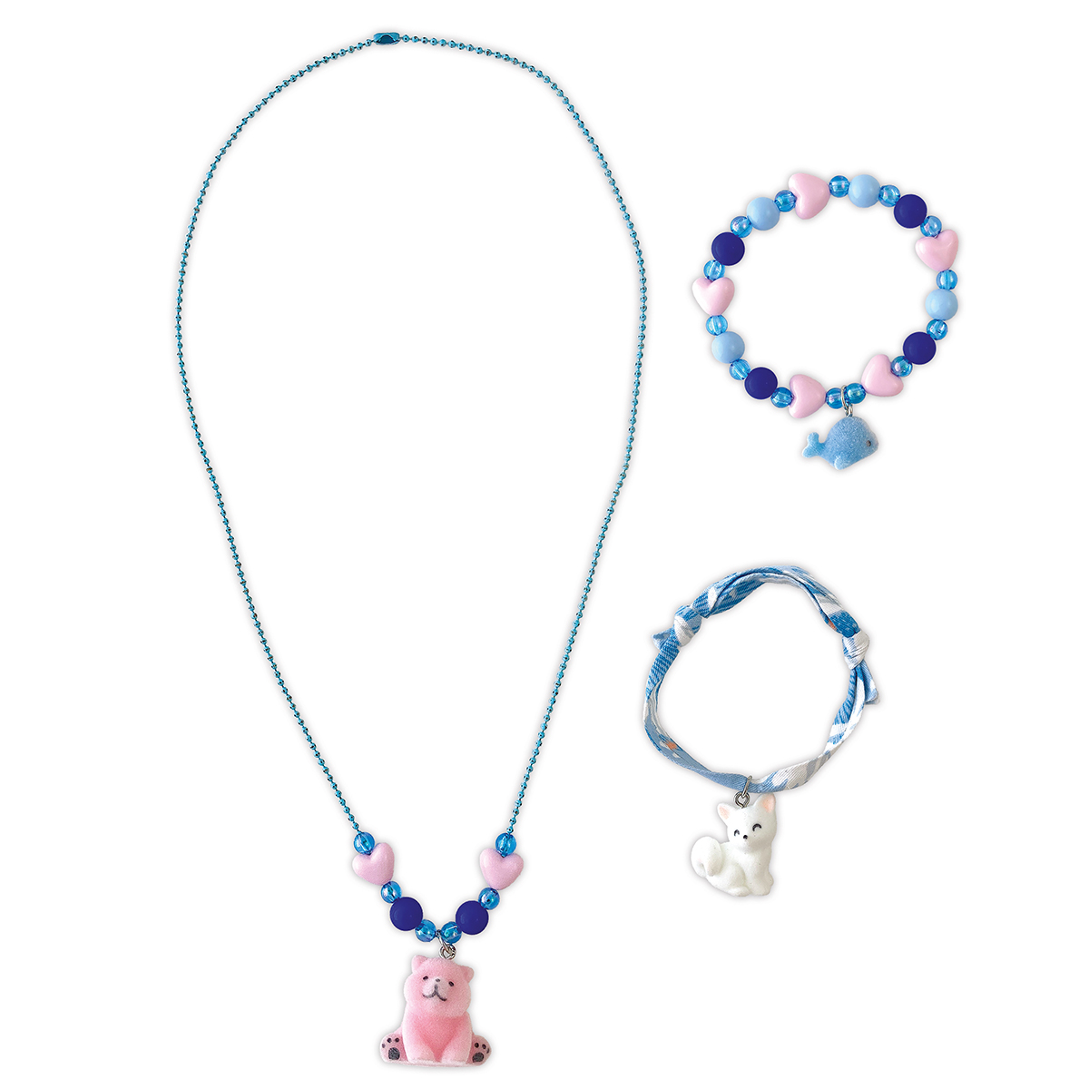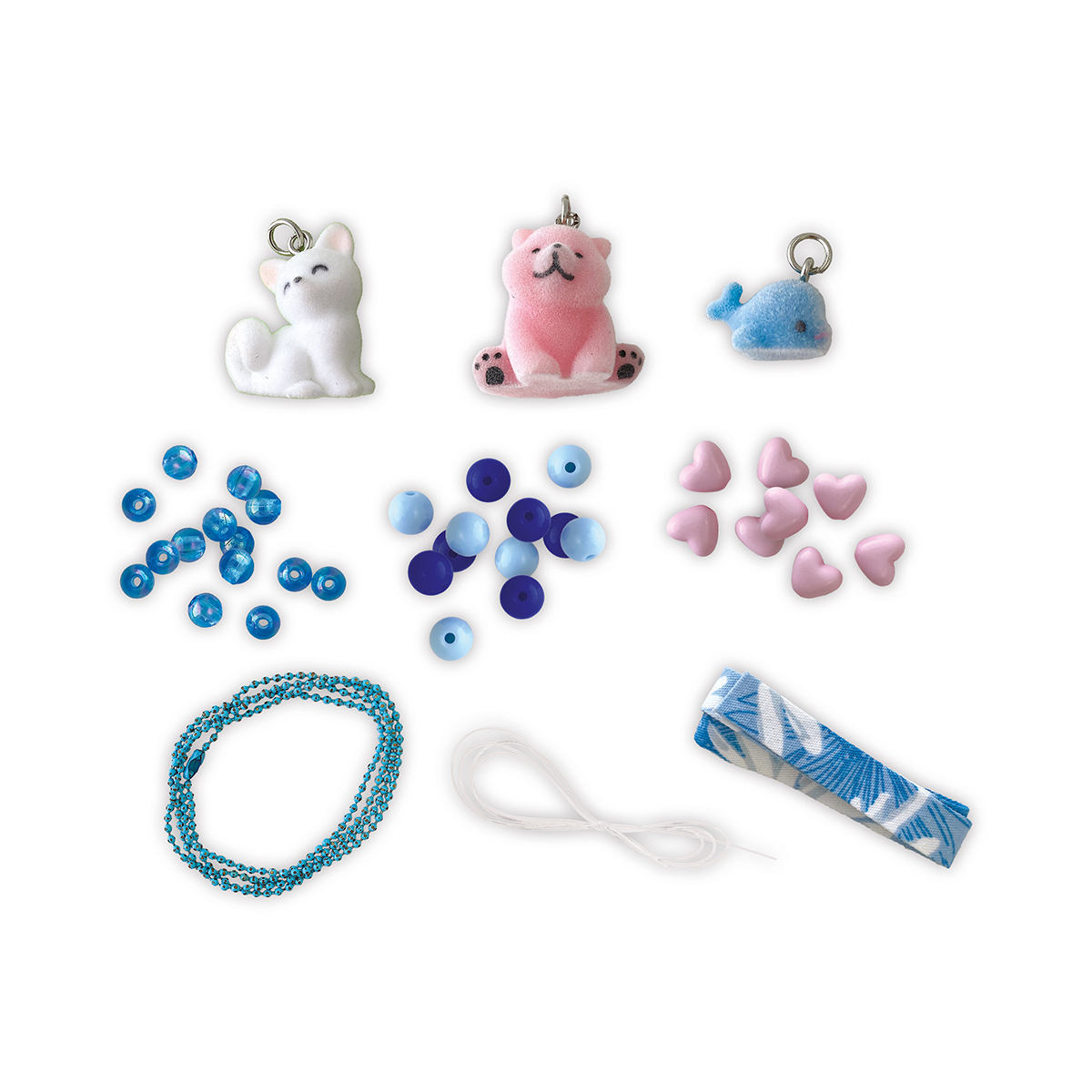Doux comme des animaux ! Ce coffret créatif permet de réaliser 2 bracelets et 1 collier à l'aide de perles et de breloques animaux recouvertes de velours ! Il contient 3 breloques recouvertes de velours (ours polaire, renard et baleine), 12 perles rondes, 7 perles en forme de cœur, 20 perles transparentes, un ruban imprimé, du fil élastique, une chaîne microbilles avec fermoir intégré et un livret avec les instructions et les modèles. Cette activité permet de développer sa dextérité et sa patience et nécessite environ 10 minutes par bijoux. Elle est idéale pour les enfants à partir de 6 ans.