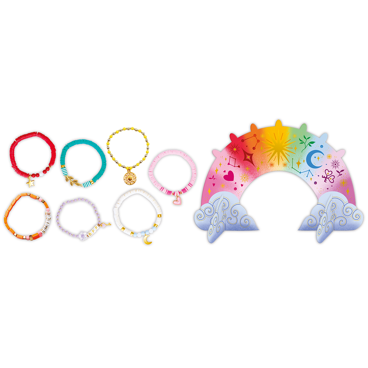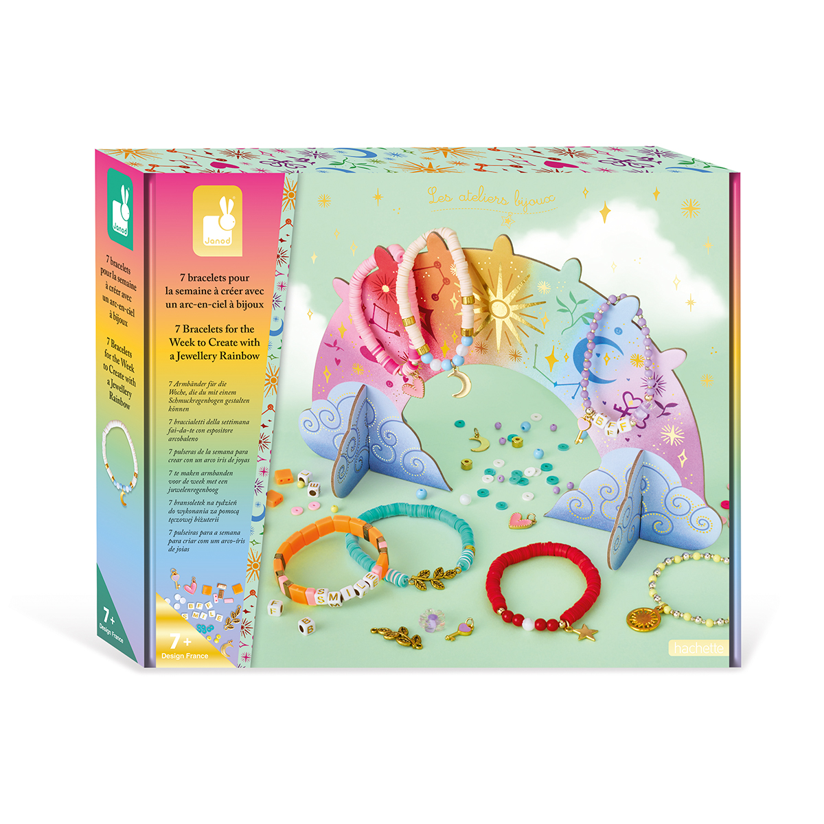 À chaque jour de la semaine son bracelet! Ce coffret créatif permet de réaliser 7 bracelets, tous associés à une couleur et à une énergie. Un joli arc-en-ciel permet également d'exposer ses bijoux une fois réalisés! Il ne reste plus qu'à choisir un bracelet selon l'énergie dont tu auras besoin en te levant chaque matin! Le coffret contient 6 breloques (étoile, lune, cœur, soleil, feuille, clef), 77 perles de rocaille, 50 perles acryliques, 4 perles en pierre de lune, 22 perles métal, 470 perles heishis, 22 perles de forme carrée, 8 perles lettres, 1 perle fleur, 8 rondelles, du fil élastique et 1 livret avec les instructions et les modèles. Cette activité permet de développer sa patience et sa créativité. Elle est idéale pour les enfants à partir de 7 ans.