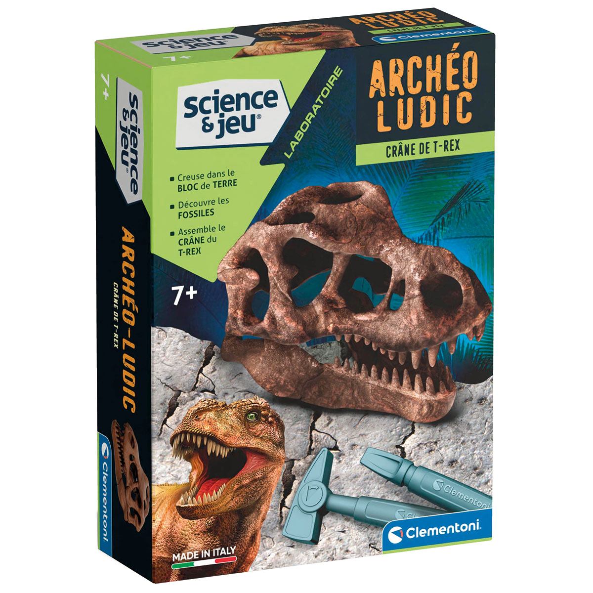 Archéo Ludic, Crâne de T-Rex. Un jeu scientifique qui fait découvrir aux enfants le dinosaure le plus redoutable du jurassique ! Le coffret contient un bloc de plâtre que les enfants viendront creuser avec un marteau et un burin pour récupérer toutes les parties d'un crâne de T-rex. Les enfants s'amuseront à reconstituer le crâne comme de véritables paléontologues !