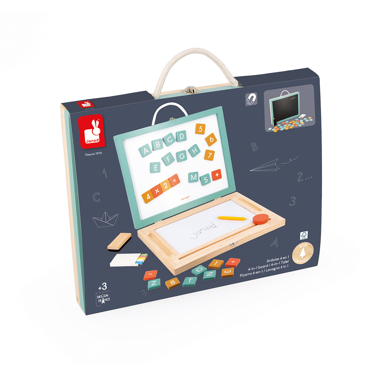 En route pour l'école avec l'ardoise 4 en 1 ! 4 activités sont réunies dans cette jolie mallette : - une ardoise magique avec son stylet. Il suffit de faire glisser la poignée de gauche à droite et le dessin s’efface comme par magie ! - une ardoise blanche magnétique avec 42 magnets (27 lettres, 10 chiffres et 5 signes) pour apprendre l’alphabet et les premiers calculs, - une ardoise noire avec sa boite de craies et sa brosse, - une ardoise blanche pour écrire avec un feutre effaçable (non fourni). Pratique, votre enfant peut l’emmener partout avec lui grâce à sa poignée en coton. Votre enfant pourra développer son imagination ainsi que l'apprentissage de l'écriture. Ardoise en bois pour les enfants à partir de 3 ans.