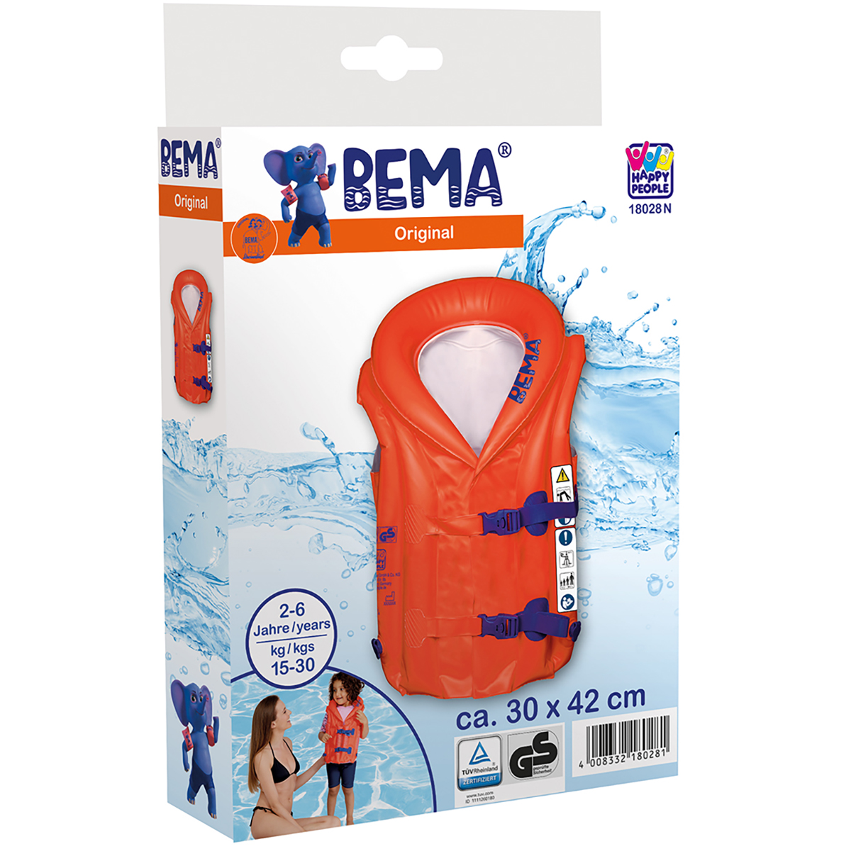 BEMA Aide à la natation orange. Le gilet est gonflé 30x42cm. Poids: 15-30kg et pour des enfants de 2-6 ans.