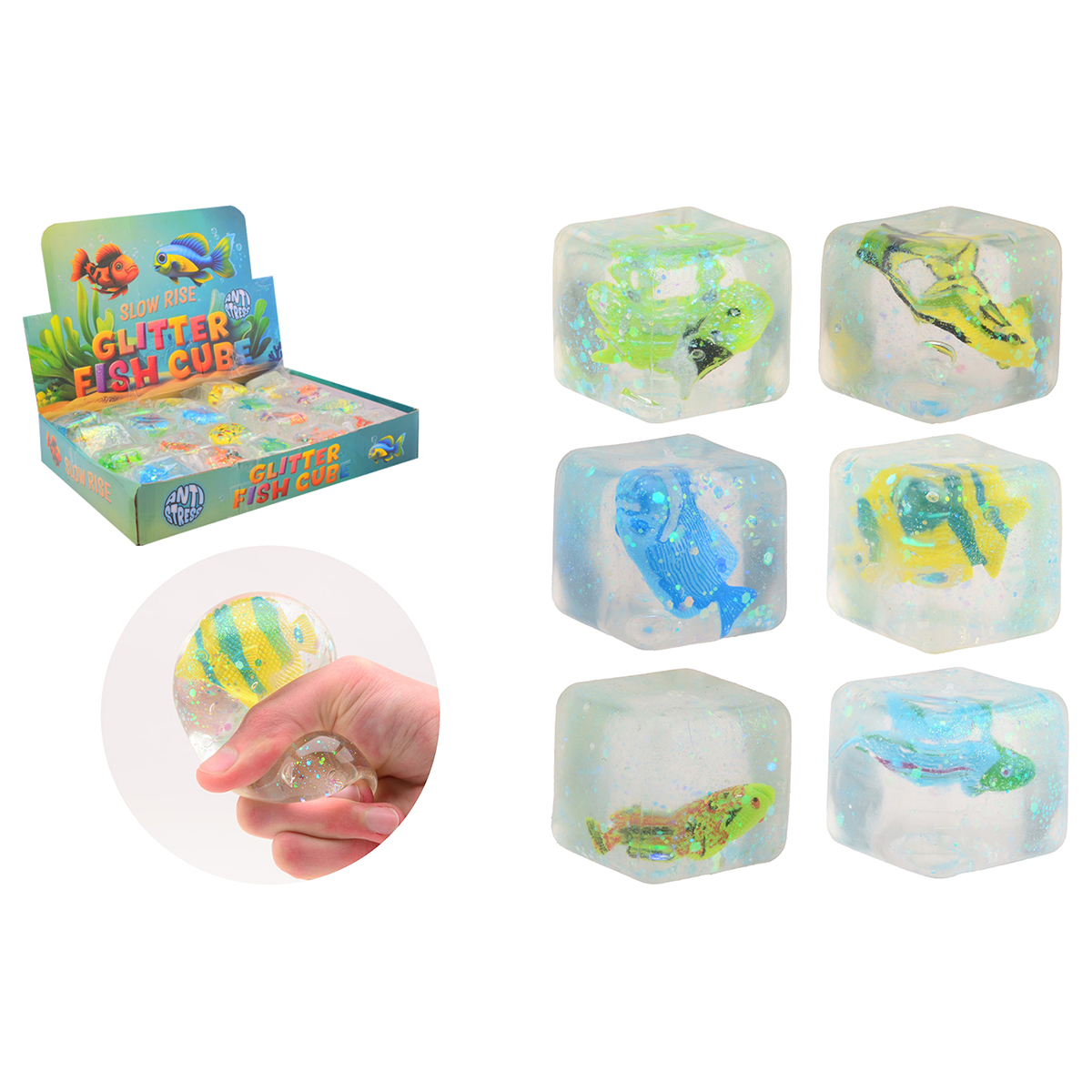 Grande balle contusionner, remplie de gel liquide et des differentes poissons pour un effet amusant lorsqu'elle est pressée. Diamètre 5cm, en différentes couleurs.