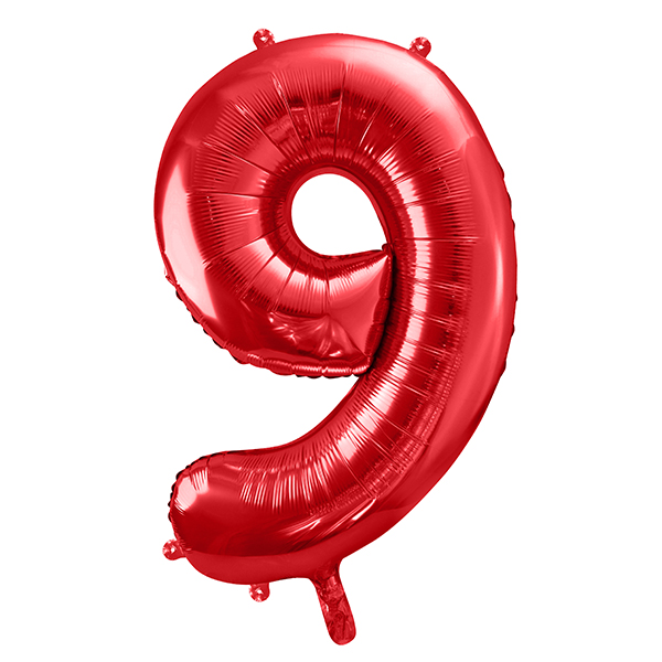 Ballon en plastique métallisé, chiffre ''9'' en rouge, taille avant le gonflage env. 100 cm (39''), taille après le gonflage env. 86 cm (34''). A gonfler avec de l'air ou de l'hélium.