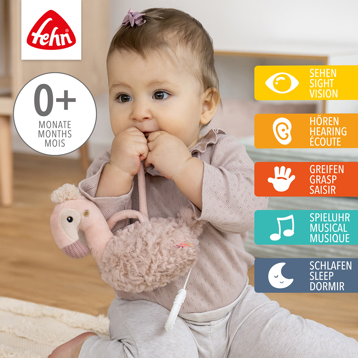 Le flamant rose câlin de la collection Lazy, Crazy & Pink n’est pas seulement un compagnon fidèle, il réconforte et apaise également avec sa douce mélodie de sommeil "Savez-vous combien de petites étoiles sont debout?"! Grâce à la taille pratique et aux sangles de fixation, vous pouvez emporter le flamant rose en peluche partout avec vous. Ressentir, câliner et aimer: il devient rapidement le meilleur ami de Bébé!