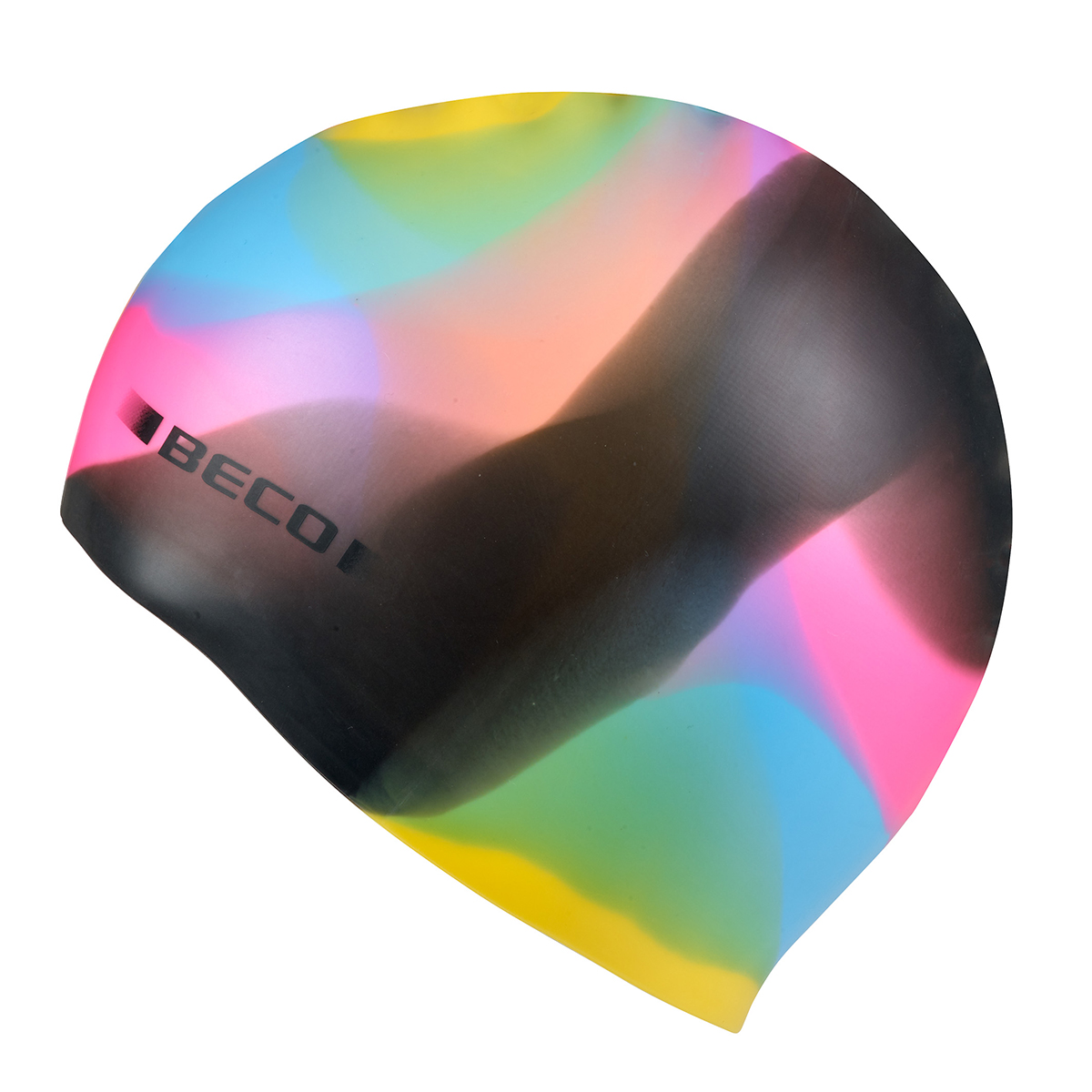 Bonnet de bain en silicone, noir multicolore, taille universelle. Le bonnet est très élastique et ajuste parfait sur la tête. La matière silicone étanche et robuste ne collée pas et offre un grand confort. Le bonnet multicolore protège les oreilles et les cheveux en plongeant.