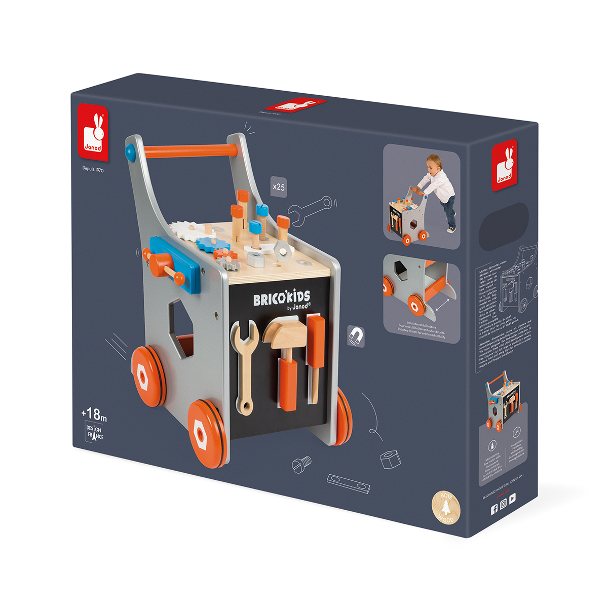 Chariot livré avec 25 accessoires pour monter et démonter des objets à l’infini, au gré de l’imagination de votre enfant! 3 outils magnétiques, un étau, un système d’engrenage composé de 4 roues, 18 accessoires (4 clous, 4 vis, 4 écrous, 6 plaquettes). Système astucieux d’outils magnétiques pour que votre enfant range ses outils à la bonne place ! Système anti bascule directement intégré à l’arrière du chariot pour permettre à votre enfant de se promener en toute sécurité. Roues silencieuses grâce aux joints en caoutchouc.- Robuste grâce aux axes des roues en métal. Roues silencieuses grâce aux joints en caoutchouc. Chariot à monter grâce à la poignée fournie.