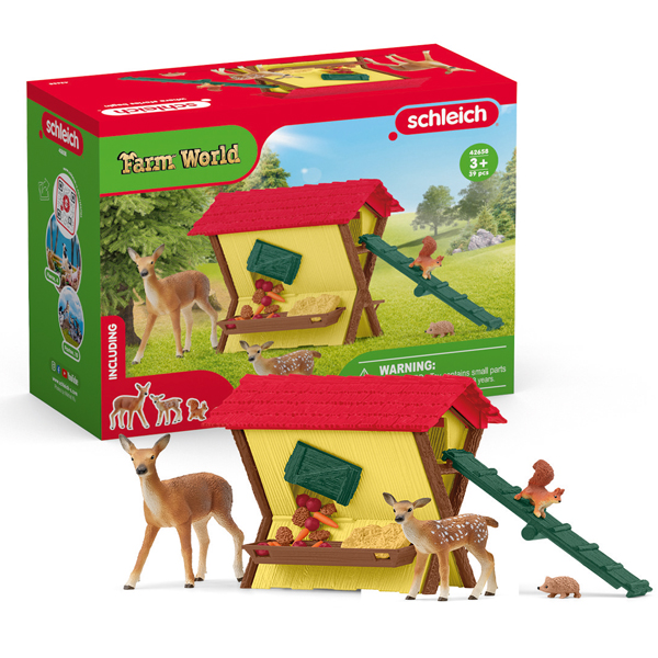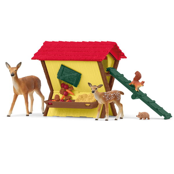 Grâce à cette cabane, les animaux de la forêt trouvent toujours de quoi se mettre sous la dent. Il y en a pour tous les goûts: pour la biche et son faon, il y a des croquettes et de délicieuses carottes. Le petit hérisson fait également son arrivée. Quant à l’écureuil, il jette un coup d’œil à travers la trappe de la cabane. Peut-être que quelqu’un lui a laissé une noix? Dans tous les cas, il a trouvé la cachette idéale juste sous le toit. Depuis cet emplacement, il peut observer le garde forestier et son véhicule (set disponible séparément).